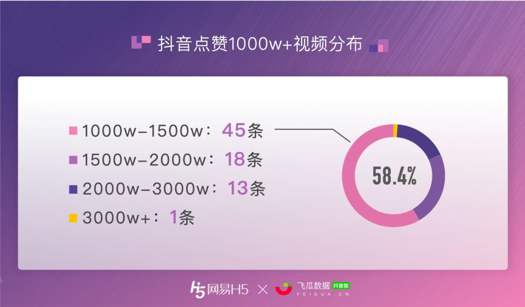 在点赞超1000w的77条视频中,有45条点赞量在1500w以下,占比58.4%。