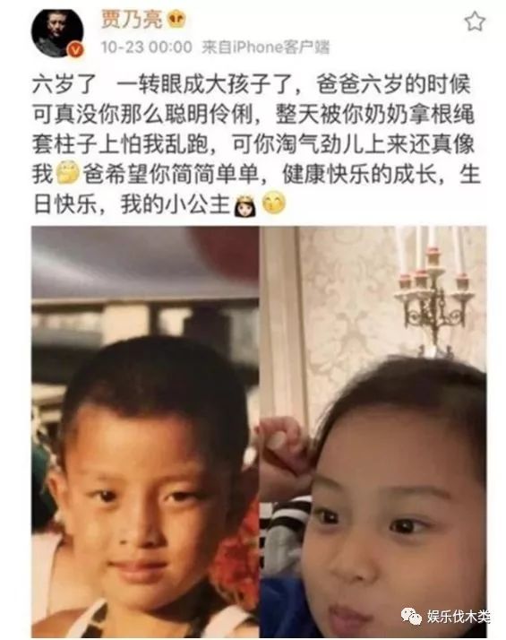 而去年,贾乃亮虽然没再发全家照,但是发了一张和女儿小时候的对比照。并且在配文中用很多文字描述自己和女儿小时候性格上有多相似。