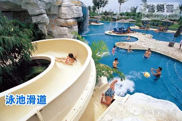 其中双层泳池配有三条落差5米的滑道。其中两条单人旋转滑道及一条双人滑道,小朋友在这里可以尽享水上乐趣。