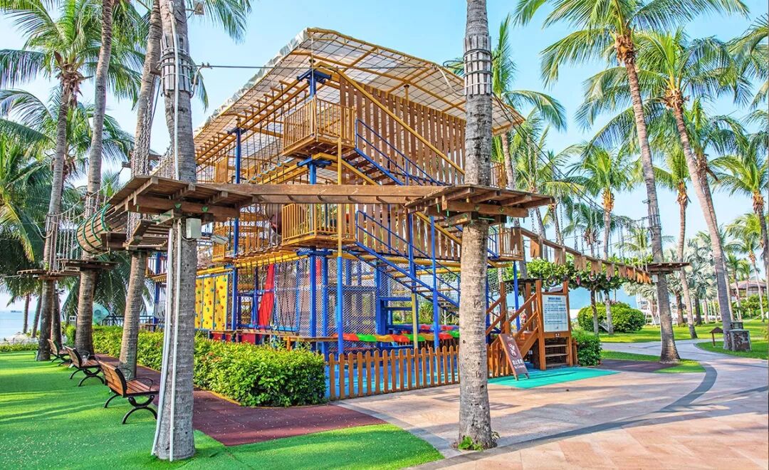 2)儿童户外设施:您和宝宝可以在在二区泳池与海水泳池之间的草坪处找到:儿童城堡、儿童滑索、儿童绳网塔、儿童秋千、儿童花样摇椅、跷跷板等户外娱乐设施。