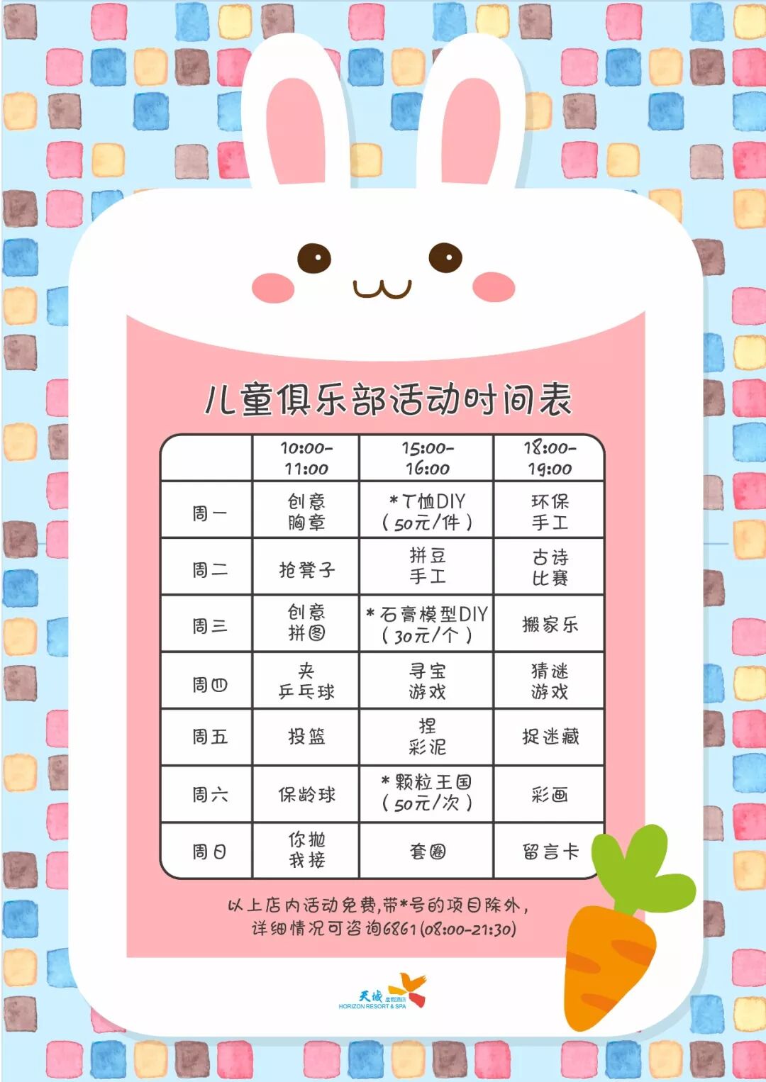 以下是酒店儿童俱乐部的活动课程,每天都有,非常丰富,爸妈们可以点图查看。(每日活动以酒店实际情况为准,部分项目需收费)