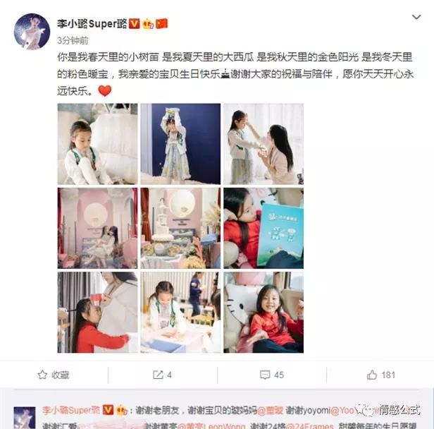 李小璐发文为女儿甜馨庆生,她在微博中写道:“你是我春天里的小树苗 是我夏天里的大西瓜 是我秋天里的金色阳光 是我冬天里的粉色暖宝,我亲爱的宝贝生日快乐,谢谢大家的祝福与陪伴,愿你天天开心永远快乐。”