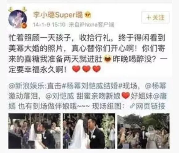 尴尬地是,李小璐第二天才在微博上给杨幂送迟到的新婚祝福,事实明明是当天她就在微博却没有表示,当然杨幂也没回复她,大概连塑料姐妹情都不想维持了。
