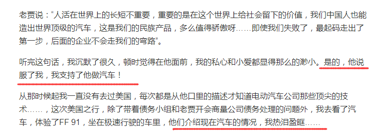 再联想到18年贾跃亭独自一人跑到美国躲债时,甘薇表现出的夫妻同甘共苦形象。她那时独自留在国内帮他还债务,还照顾三个孩子。在那篇《一个妻子的独白》中,还表现出了对贾跃亭做汽车梦的无比崇拜和支持。