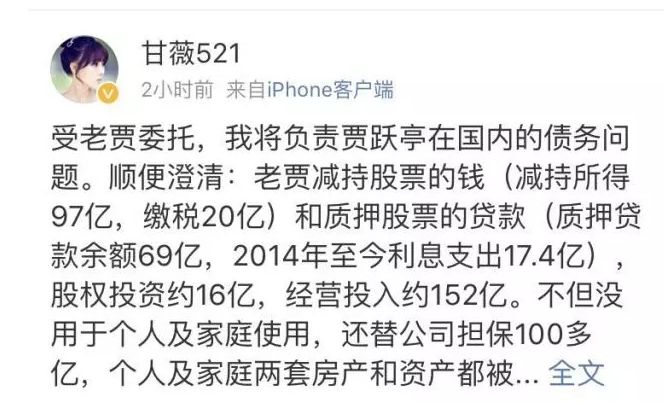 事业风光的同时,甘薇16年8月又给贾跃亭生下了一个儿子,本来打算稳过乐视老板娘的百亿阔太生活,然而好日子只持续了一年,就因乐视债务危机一夜之间变成了欠债14亿的老赖,真是想都不敢想吧。