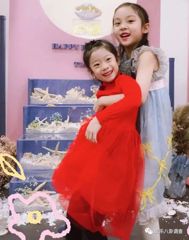 张蕾晒出的照片中是女儿豌豆与甜馨的合照,豌豆和甜馨是同班同学,两个人合照中身为小寿星的甜馨长发披肩,身着浅蓝色纱裙搭配白色打底裤,淑女范儿十足。张蕾女儿则扎着小辫穿着红色纱裙,见到好友的甜馨十分开心,一把将豌豆从身后抱起,又暴露女汉子属性。