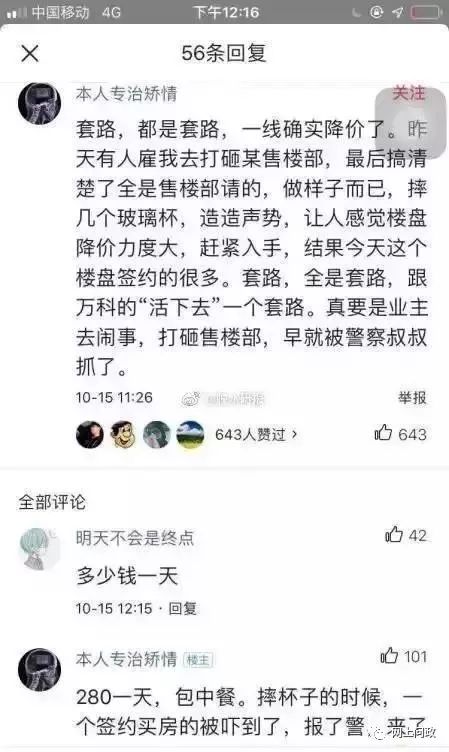 众多网友也纷纷发表了自己的看法洒水的牛:我早就觉得“房闹”太假了,一般人去闹事,早就被抓了!原来房闹都是开发商雇的托。学习他不爱我:身边也有朋友接到过类似的“业务”,冒充房闹前往售楼处“闹事”,营造一种这个楼盘降价幅度很大的错觉。大表哥不爱吃米线:如果是真的,那想出这个主意的人真的是营销高手!太洞察人性了!对此,小编表示,首先这个事情不知道是真是假,而且全国近期因为房价闹事的事情非常多,真真假假确实让人难以判断,如果确实存在这样的营销手段,只能说这些房地产开发商真的是情商和智商都太高了,真的是营销的高手。现在的房地产开发商都有很大的资金压力,着急卖房,除了适当降价,也开始提高各种营销手段了,如果真的有这种情况,小编认为也是比较有可能的。