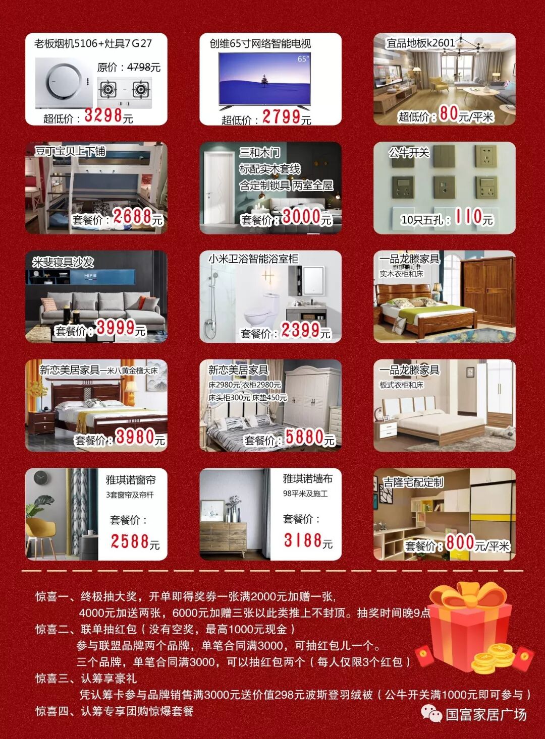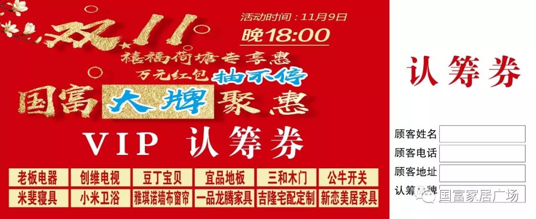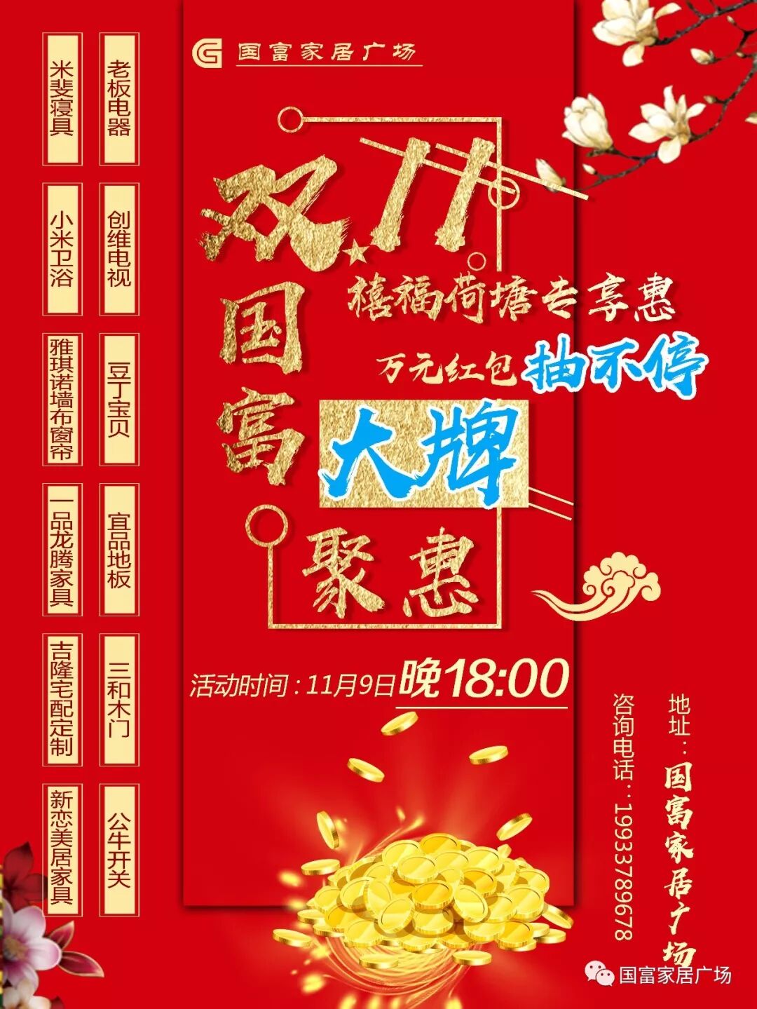 11月9日晚18:00,国富家居广场“大牌”联盟,“禧福荷堂”专享惠,万元红包抽不停,多重豪礼等您拿!
