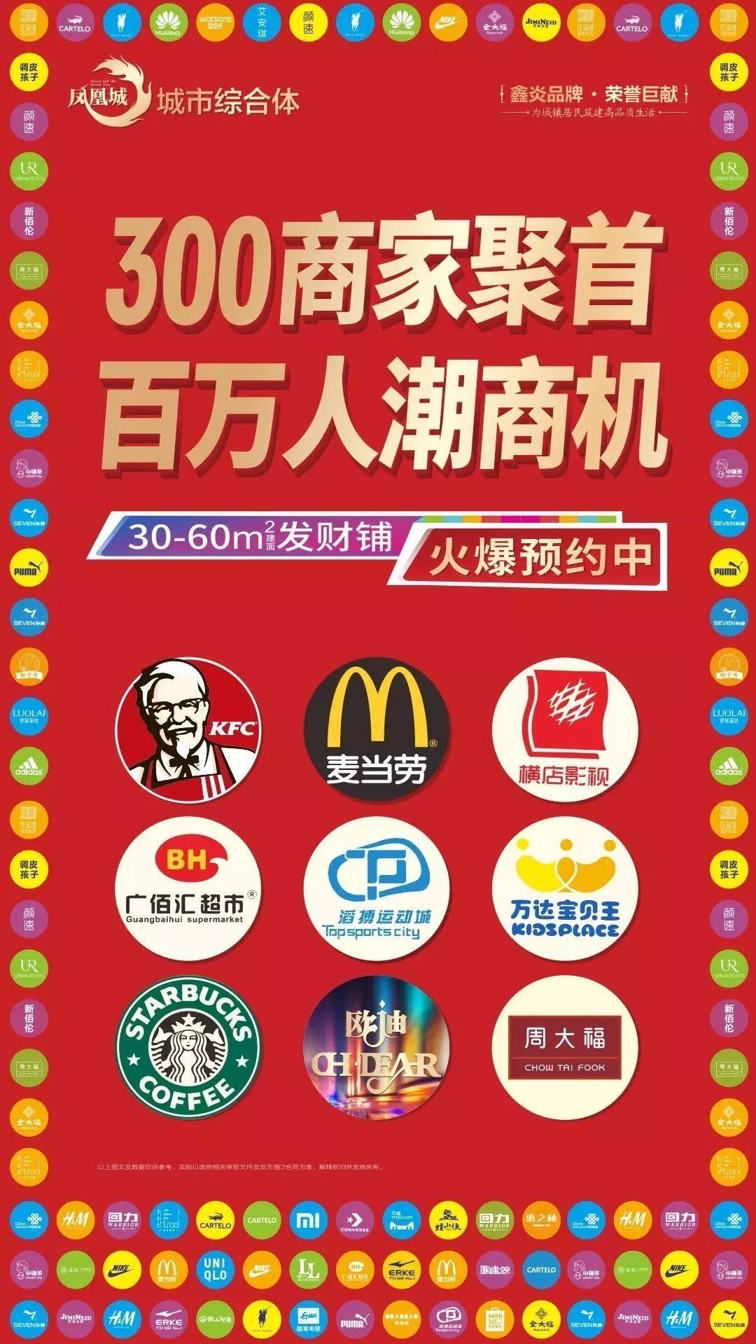 目前,已有万达宝贝王、星巴克、麦当劳、肯德基、横店影城、滔搏运动、周大福、广佰汇超市等9大主力店,近90家一线大牌签约进驻凤凰城!