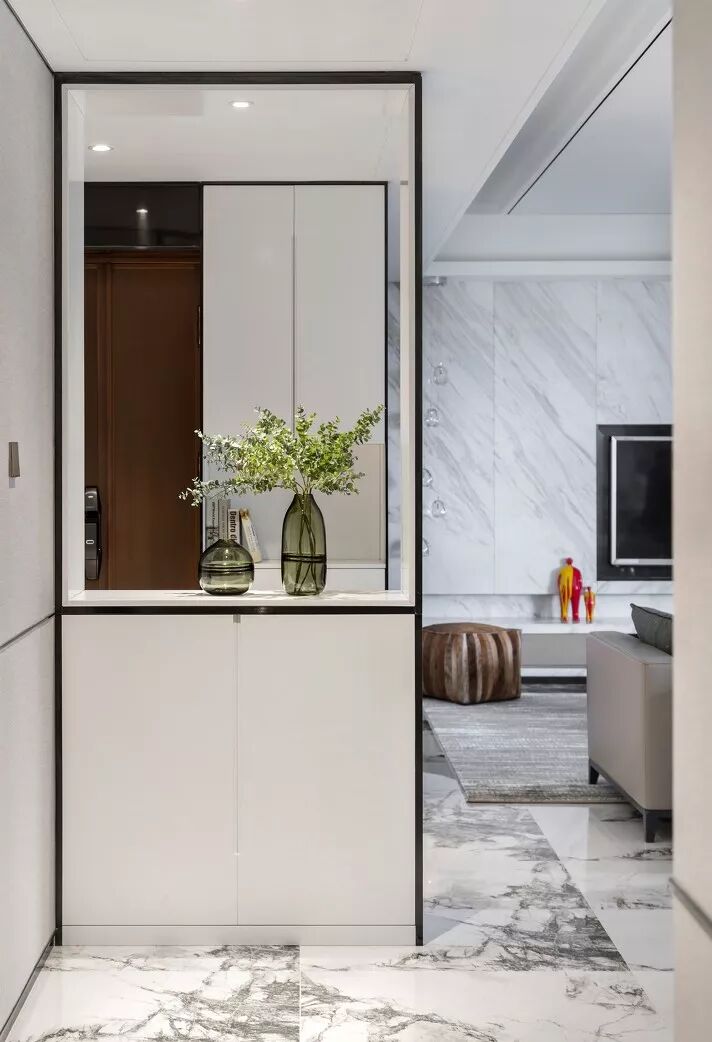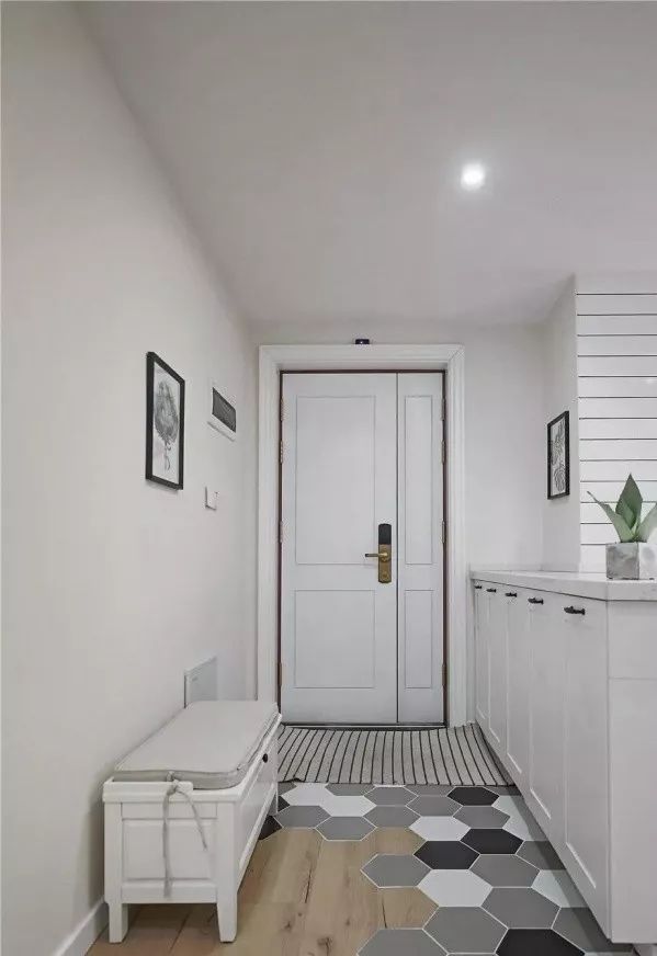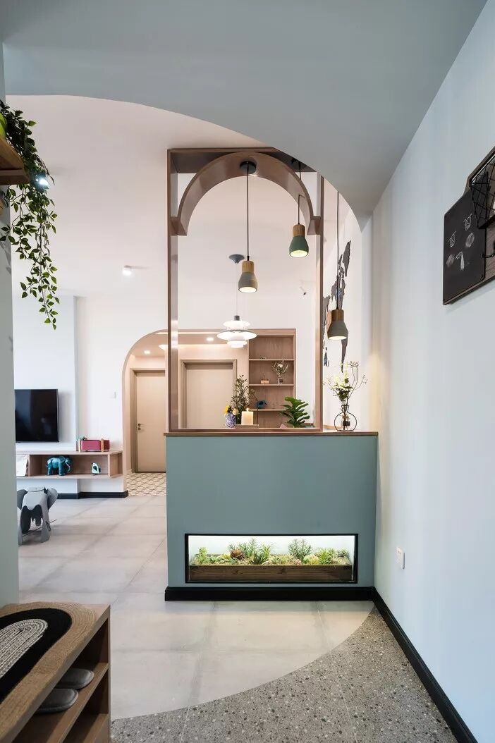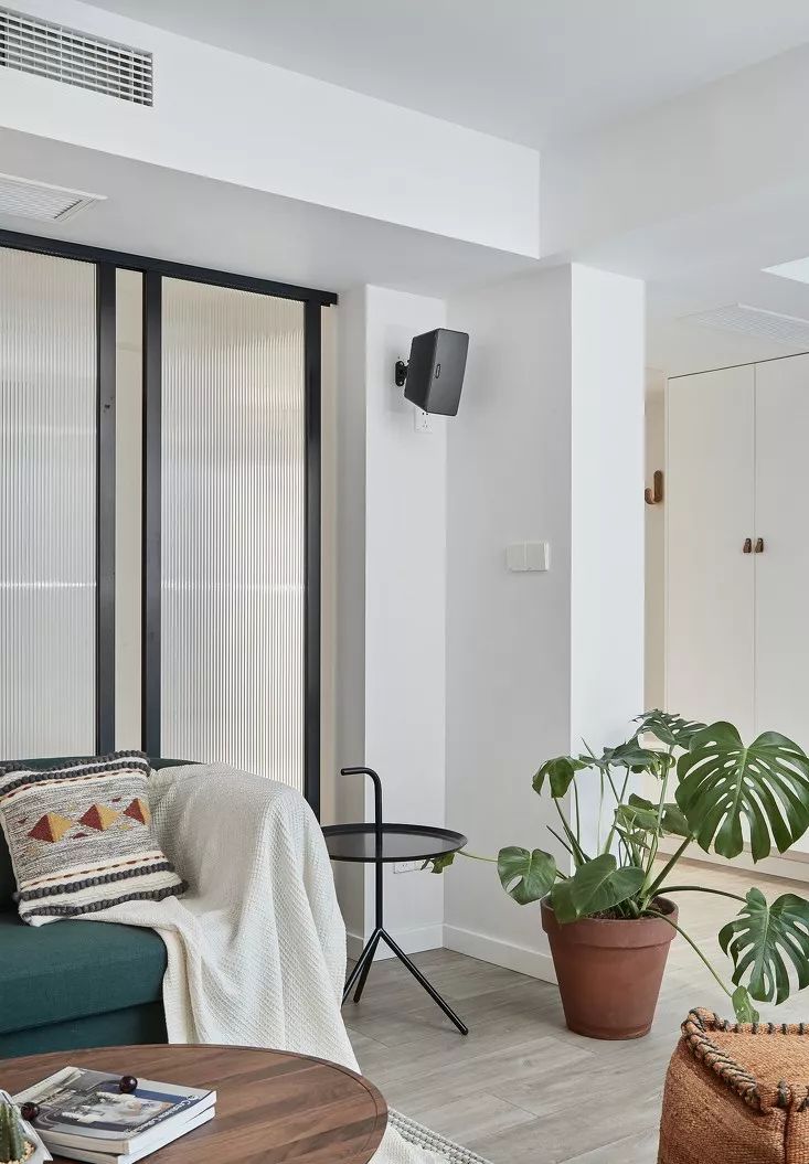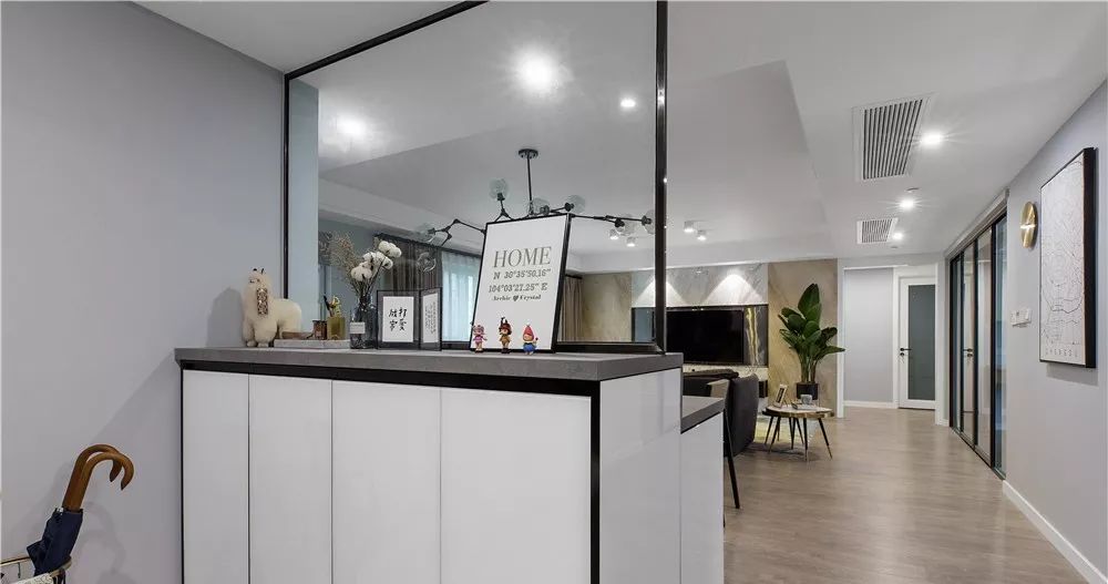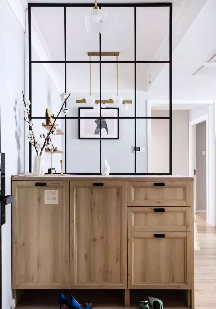 为了避免进门就看到房子的全貌,屋主在玄关处装了一块玻璃,适当阻挡下视线。