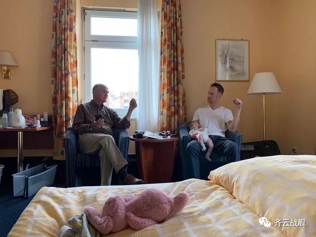 爷爷在就酒店房间里和雷特聊着天,小家伙就躺在爸爸腿上睡着了。