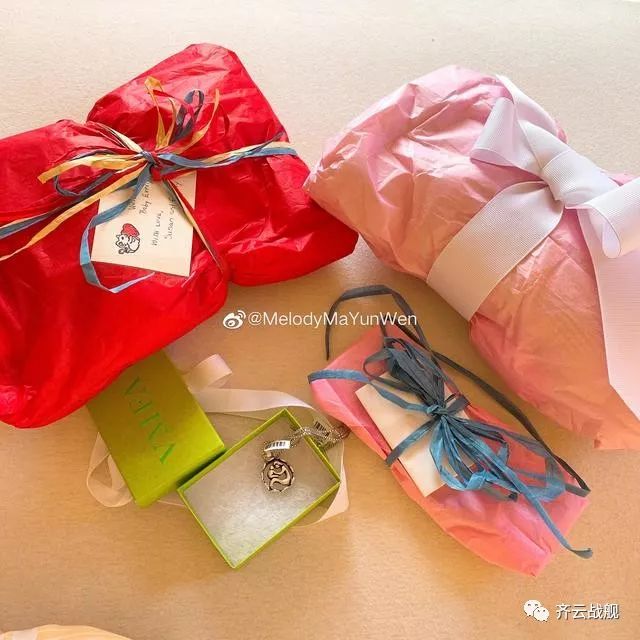 爷爷奶奶还给儿媳妇和孙女准备了几份礼物,红色包装袋上附着一张小卡片,上面写着,“欢迎我们可爱的Everly,爱你的爷爷奶奶。”