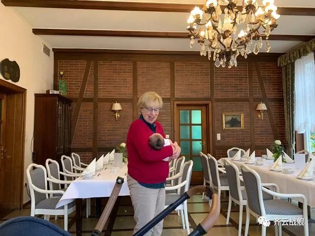 从背景来看是一家高级酒店的餐厅,奶奶哄着孙女,一脸慈祥。