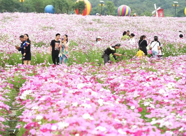 近日,广西南宁市邕宁区顶蛳山花海景区内波斯菊盛开,吸引众多游客前来观赏。