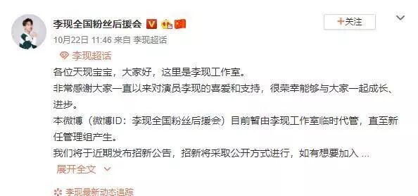 10月22日,李现工作室宣布将临时代管李现全国粉丝后援会微博,希望经过这次调整往后会越来越好。