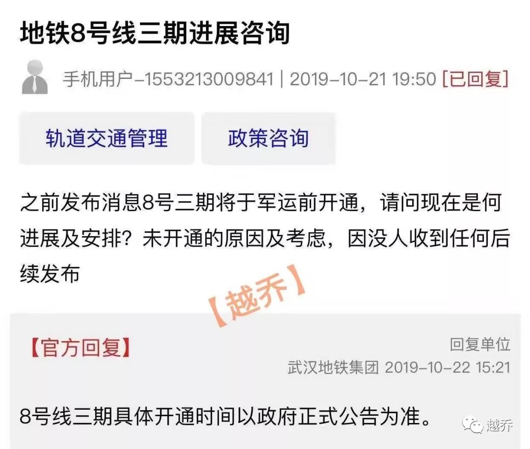 据武汉地铁集团回复8号线二期将于2020年底开通