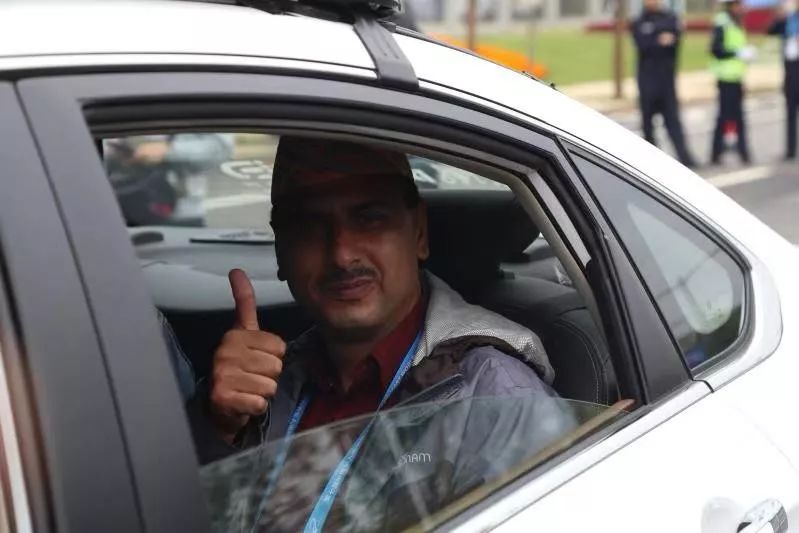尼泊尔新闻官伊斯瓦尔·什里什塔一边体验东风自动驾驶汽车,一边竖起了大拇指。
