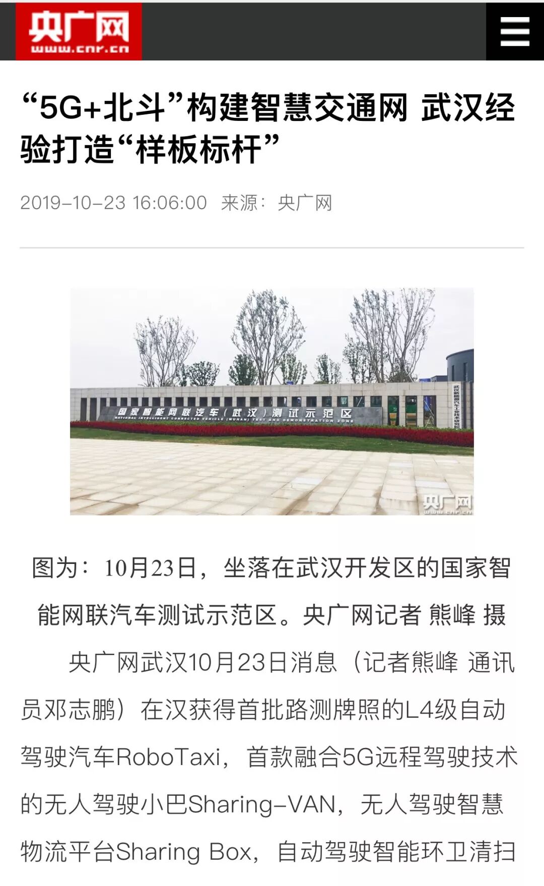 武汉国家智能网联汽车示范区是武汉重点打造的“国之重器”,已建成5G+北斗导航开放公路28公里,是国内最大的无人汽车测试基地,也是国内建成的首个大规模商用5G车联网,实现了远程驾驶、车路协同。