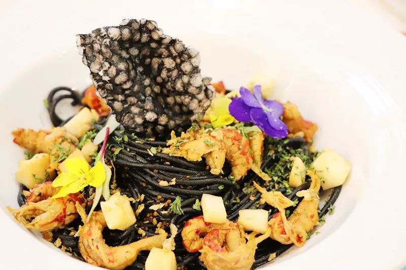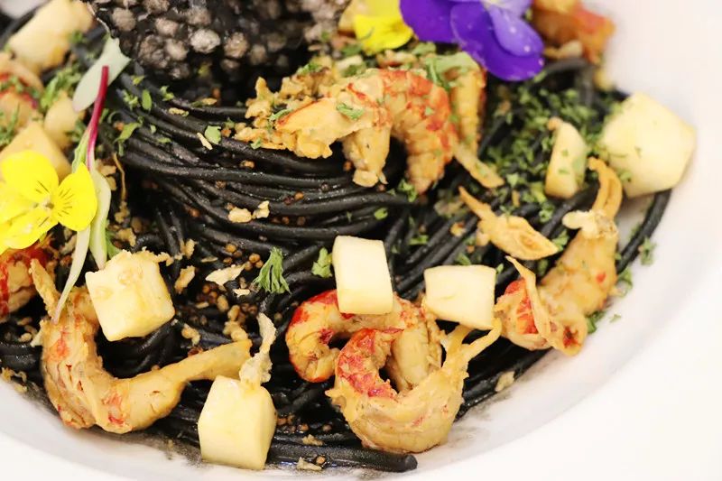 武汉的名片小龙虾在OLLiOLLi的餐品里也有体现,一端上桌就能闻到浓郁的海洋香味,黝黑的墨鱼汁混入意面之中,给人一种深海深处的神秘感。