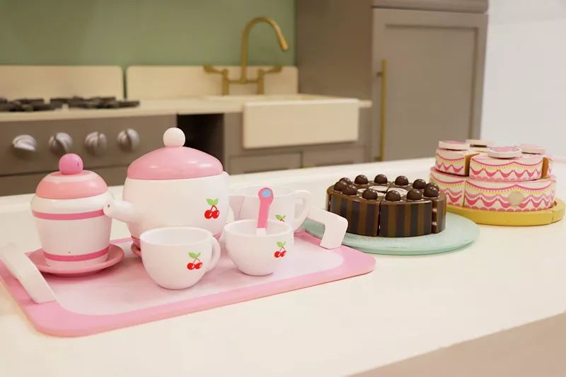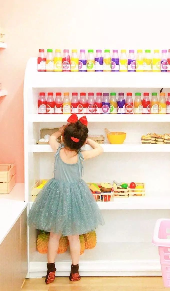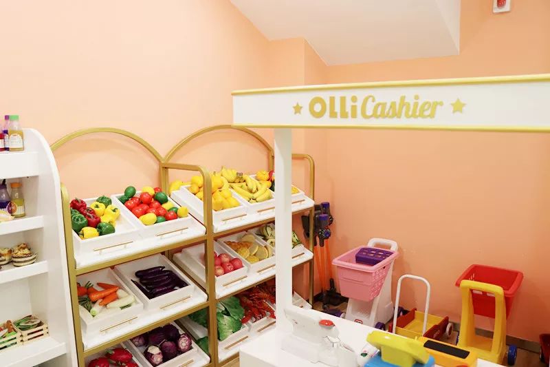 小超市里的食物几乎达到了以假乱真的程度,美国知名幼教品牌 Melissa doug的调料玩具和英国木作玩具高端品牌Le toy van的下午茶套装彩色涂料都是安全无毒,真实的摆在货架上,小朋友自主的拿起过家家,分分钟就玩开了~