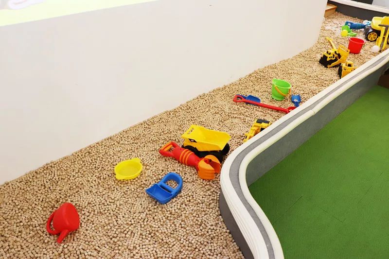 一圈围绕中心的“沙坑”还略淡淡淡的青草香味,这里面放的可不是砂砾,而是店家特意购买的进口扁柏木,木质清香可以释放植物杀菌素,抗菌功效一流,即便是皮肤敏感的小朋友也可以放心玩耍~