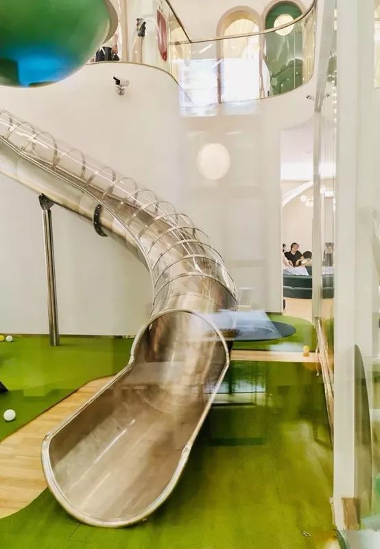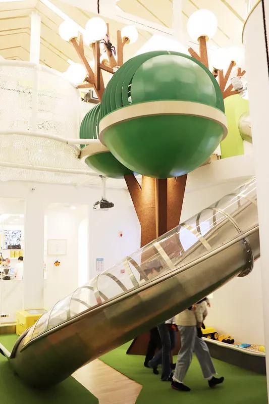 从上层一路滑下来,风从耳旁呼呼而过,透过滑梯玻璃还可以窥见外面的风景,过程略带刺激,情绪也分分钟兴奋起来。