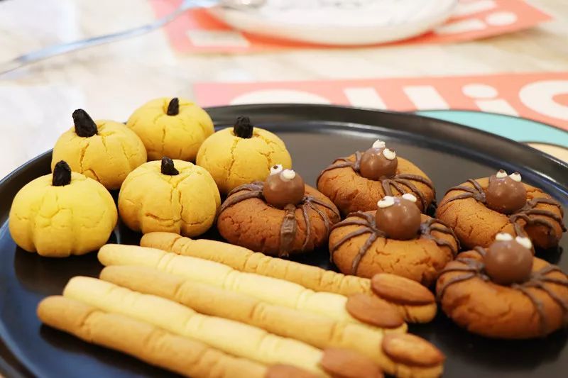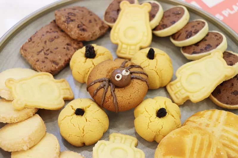 因为即将到来的万圣节,店内还上新了超可爱的万圣节小饼干。巧克力与曲奇饼是天生的好朋友,浓郁的巧克力、松脆的杏仁粒、优质的小麦粉,在烤箱的高温下慢慢发酵,美味翩然而至。