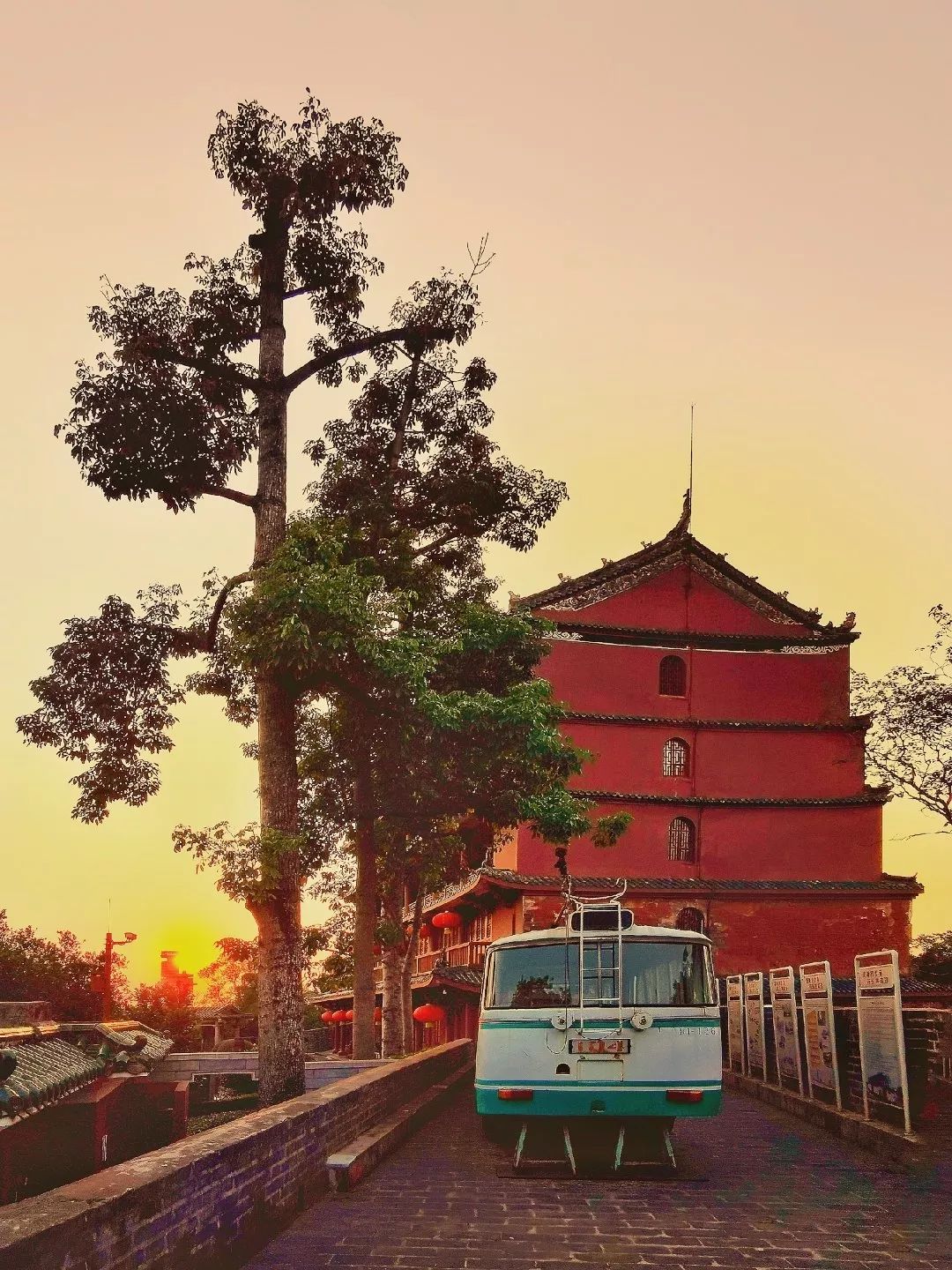 夕阳西下,天空被染得金黄,这幢红墙绿瓦更显雄伟壮观。