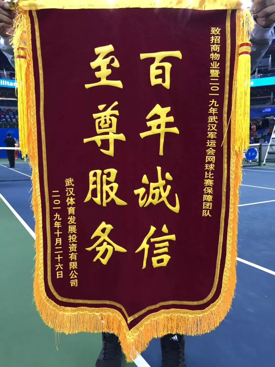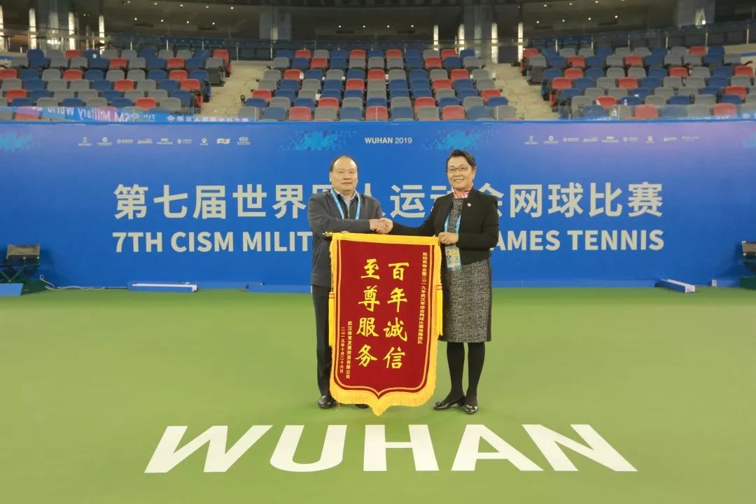 10月26日晚10时,第七届世界军人运动会网球比赛圆满落幕。武汉体育发展投资有限公司总经理李秋萍同志代表军运会网球竞赛委员会向招商物业赠送了“百年诚信,至尊服务”的锦旗,并高度赞赏了招商物业提供的2019年武网WTA保障服务和第七届世界军运会网球赛事服务。