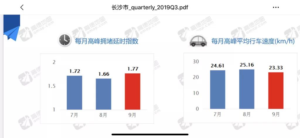 长沙市三季度高峰拥堵延时指数1.716,即高峰出行时间是畅通状态下的1.716 倍,高峰平均行车速度24.34km/h。 其中,9 月拥堵最严重,高峰期拥堵延时指数1.77,高峰期城市平均行车速度23.33km/h。