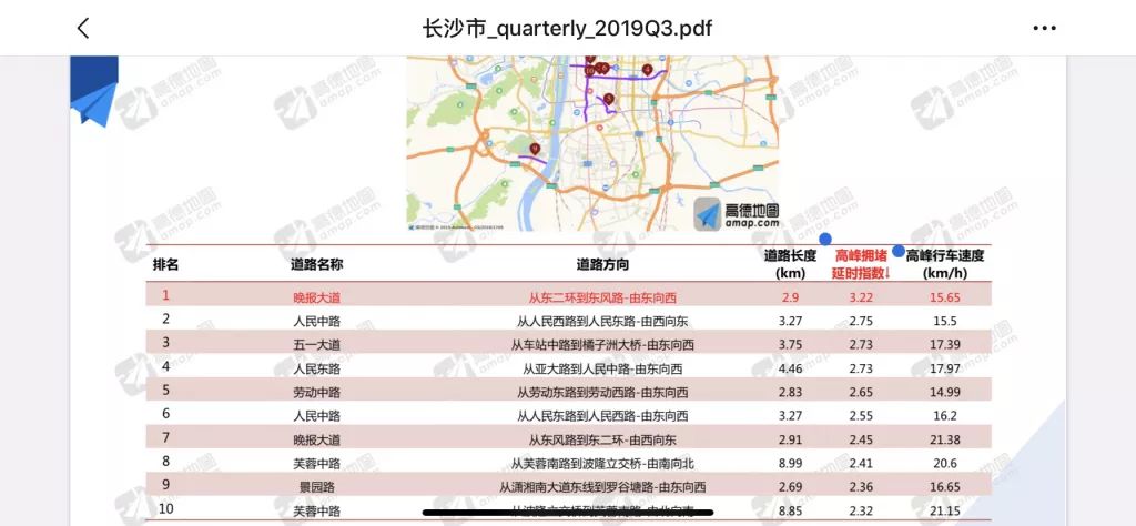 上班日晚高峰拥堵道路排名:晚报大道(从东二环到东风路—由东向西)高峰行车速度15.65km/h。其次为人民中路、五一大道、人民东路、劳动中路、人民中路、晚报大道、芙蓉中路、景园路、芙蓉中路。