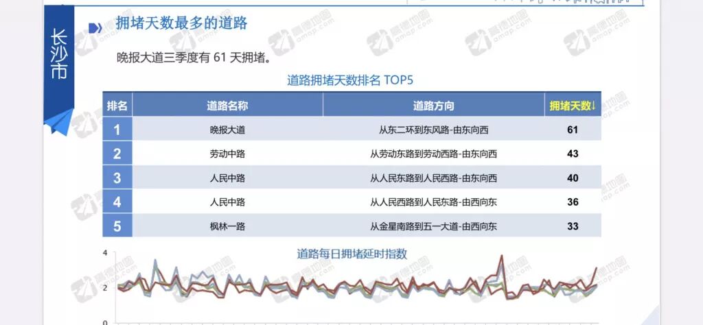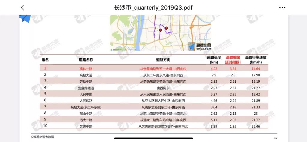 报告显示,上班日早高峰拥堵道路排名:枫林一路(从金星南路到五一大道—由西向东),高峰行车速度14.64km/h。其次为劳动中路、晚报大道、营盘路隧道、人民中路、人民东路、晚报大道(东二环东侧)、韶山中路、远大一路、芙蓉中路。