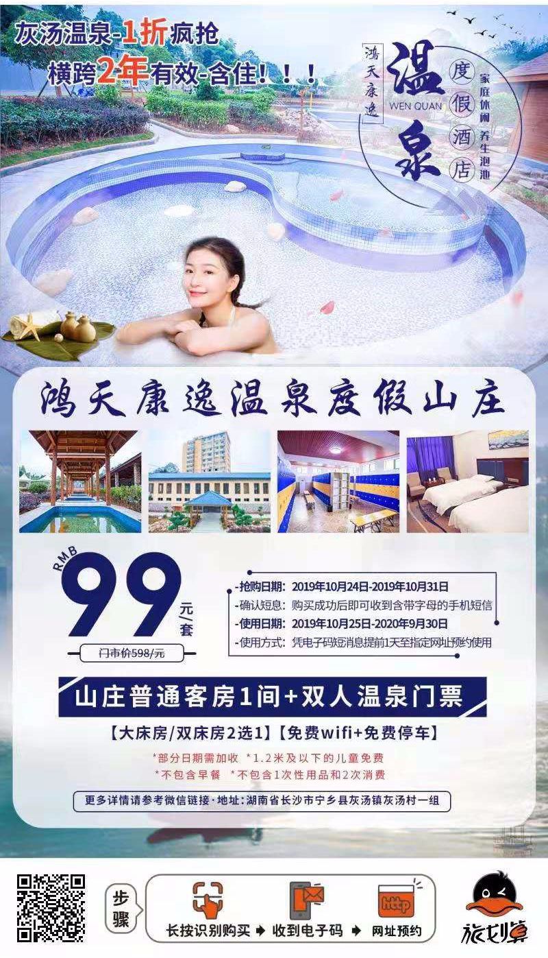 现仅需 99元/套山庄普通房1间/1晚(大床/双标间2选1)双人单次温泉门票