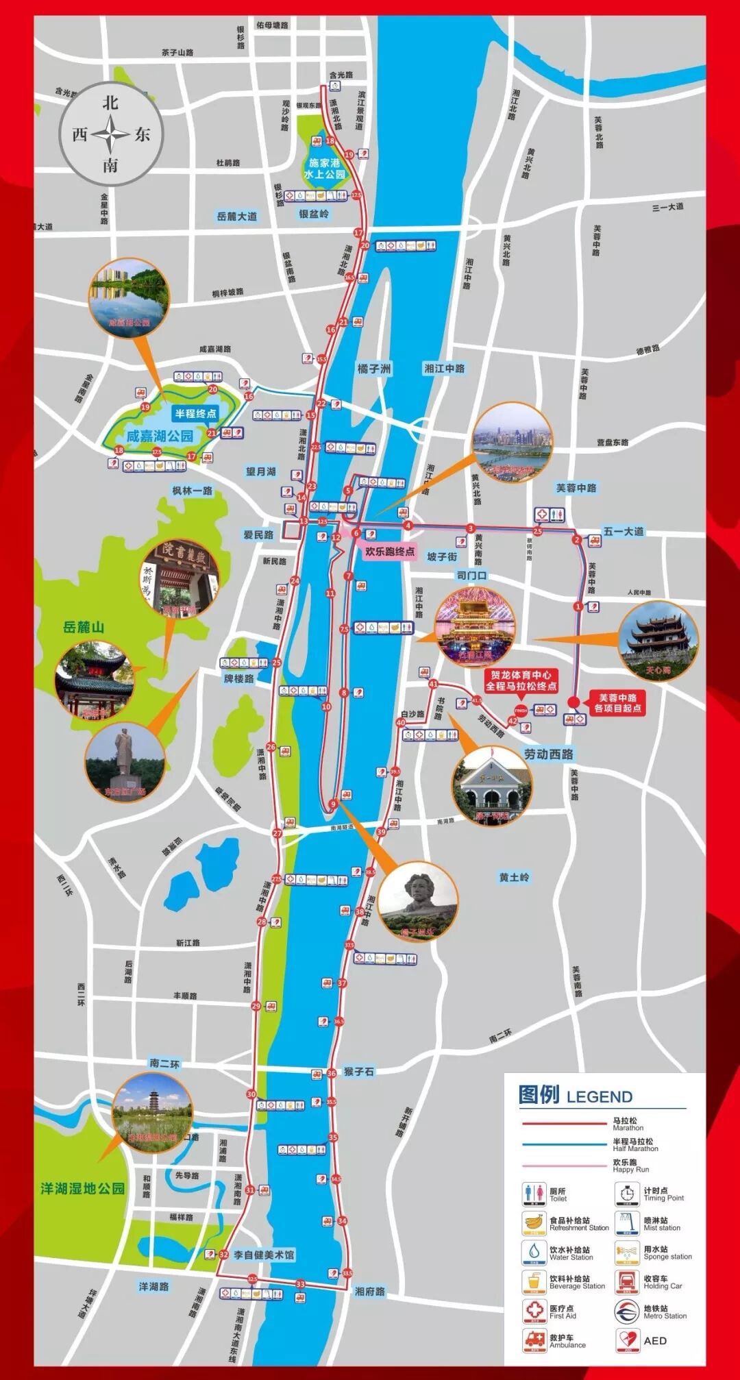 芙蓉中路 (贺龙体育中心东广场旁)——芙蓉中路往北(全幅)——芙蓉中路往北(人民西路口西半幅逆行)——五一大道往西(南半幅逆行)——橘子洲大桥上桥往西(全幅)——橘子洲北引桥下桥往北——西侧橘洲路往北——橘洲沙滩体育文化园折返沿东侧橘洲路往南——橘子洲头折返沿西侧橘洲路南往北——橘子洲南引桥上桥往西——枫林一路往西(南半幅逆行)——爱民路往南——爱民路往东——潇湘中路往北(西半幅逆行)——龙王港高架桥往北(西半幅逆行)——龙王港高架桥下桥往北——潇湘北路往北(西半幅逆行)——含光路路口折返往南——潇湘北路往南(东半幅逆行)——潇湘中路往南(东半幅逆行)——潇湘南路猴子石大桥往南(全幅)——潇湘南路往南——洋湖路往东(逆行)——湘府路大桥西侧北引桥往东(逆行)——湘府路大桥往东(北半幅逆行)——湘府路大桥东侧北引桥下桥(北半幅逆行)——湘江南路往北(西半幅逆行)——湘江中路往北(西半幅逆行)——白沙路往东(北半幅逆行)——书院路往北(东半幅)——劳动西路往东(北半幅逆行)——天剑路往北(全幅)——贺龙体育场南门 (终点)。