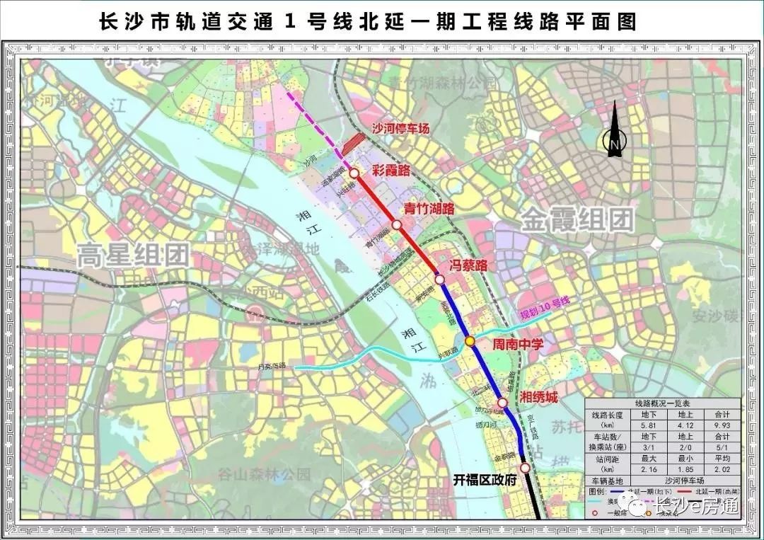 1号线北延一期北起彩霞路站,沿芙蓉北路由北往南敷设至开福区政府站与1号线一期工程连通,全长约9.93公里,共设车站5座,分别为彩霞路站、青竹湖路站、冯蔡路站、周南中学站、湘绣城站,其中高架站2座、地下站3座,含换乘站1座。