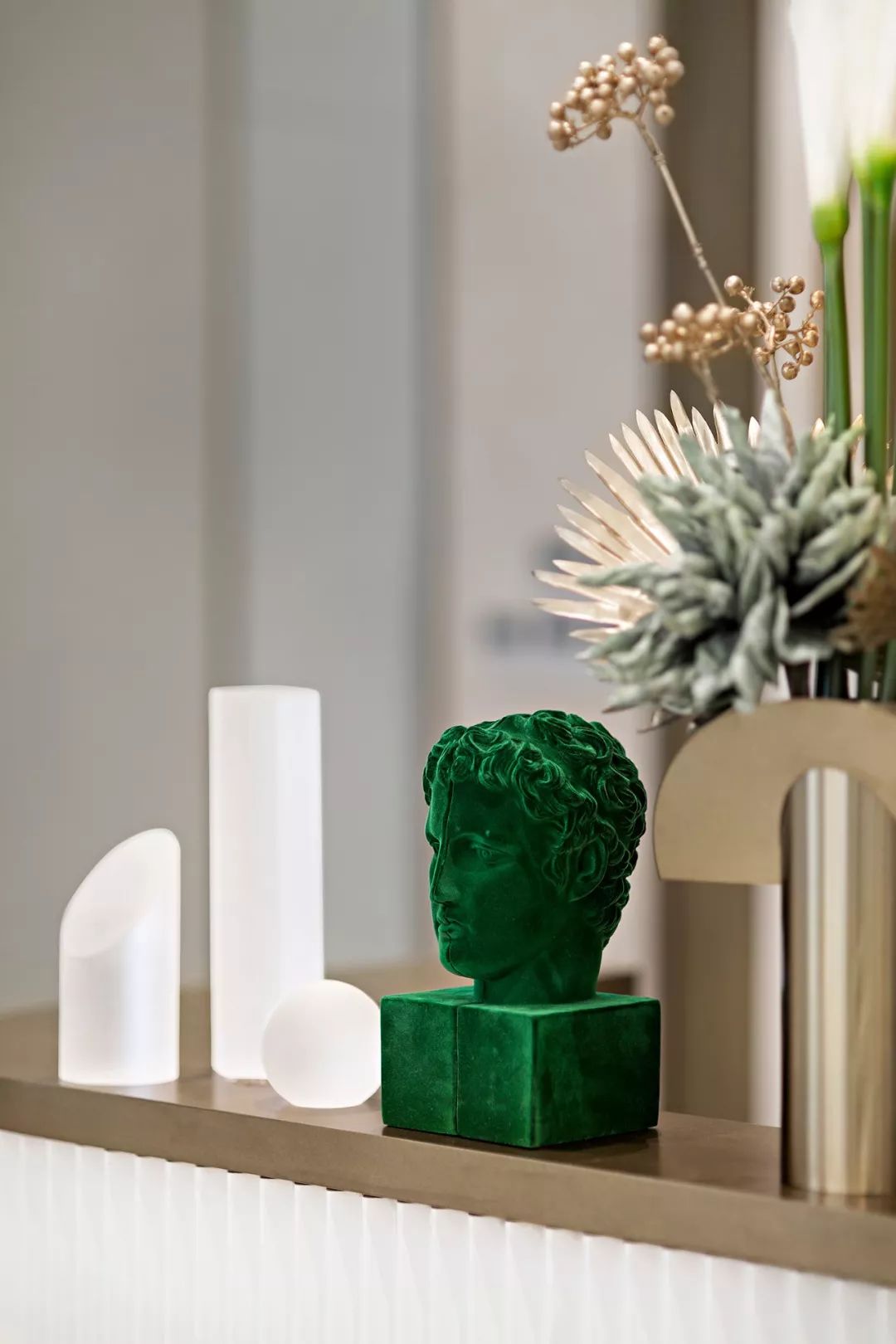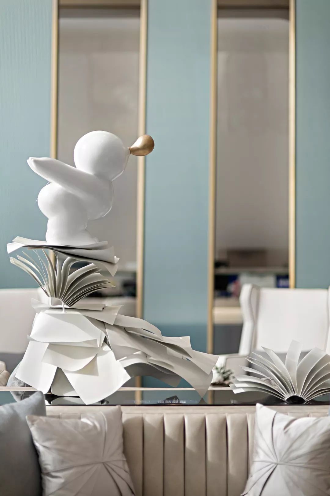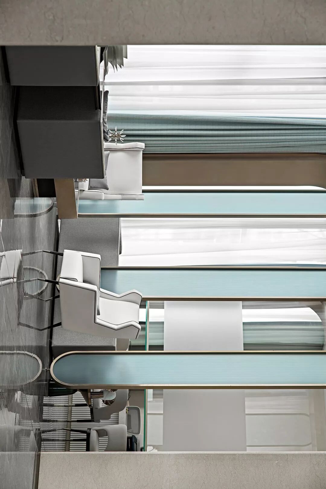 大块面低饱和度的蓝色在简白的整体调性中,一跃成为空间的核心体块,静谧澄净的蓝,却拥有着强大的蝶变力量和心灵治愈功能,使空间更具时尚感及层次感,亦不失高雅的气质。
