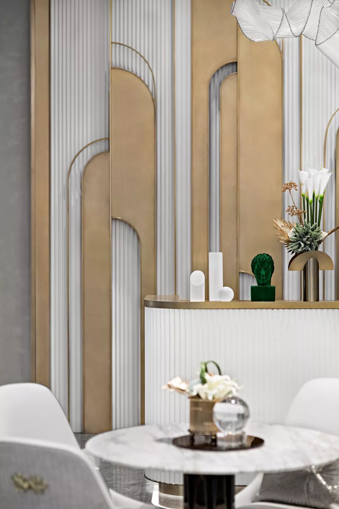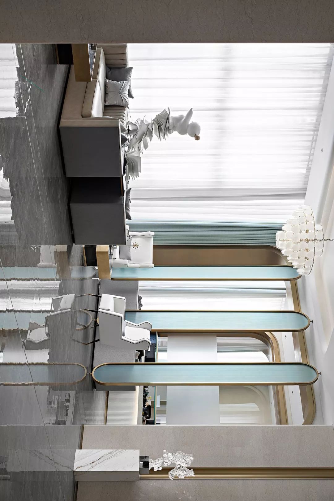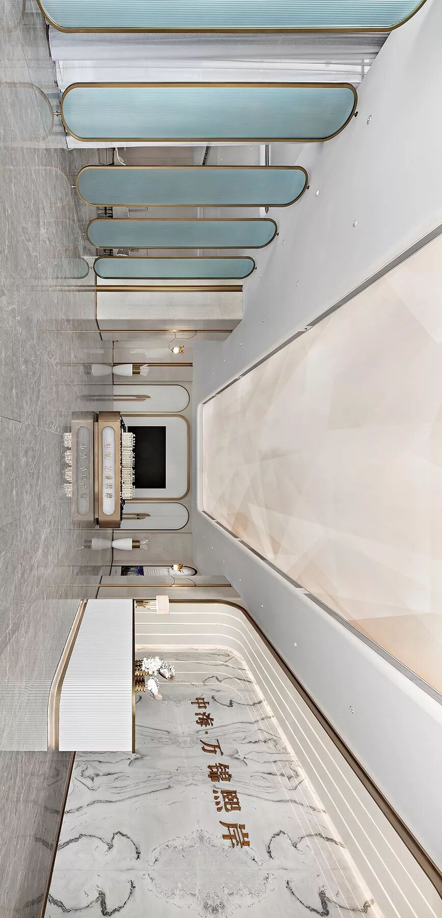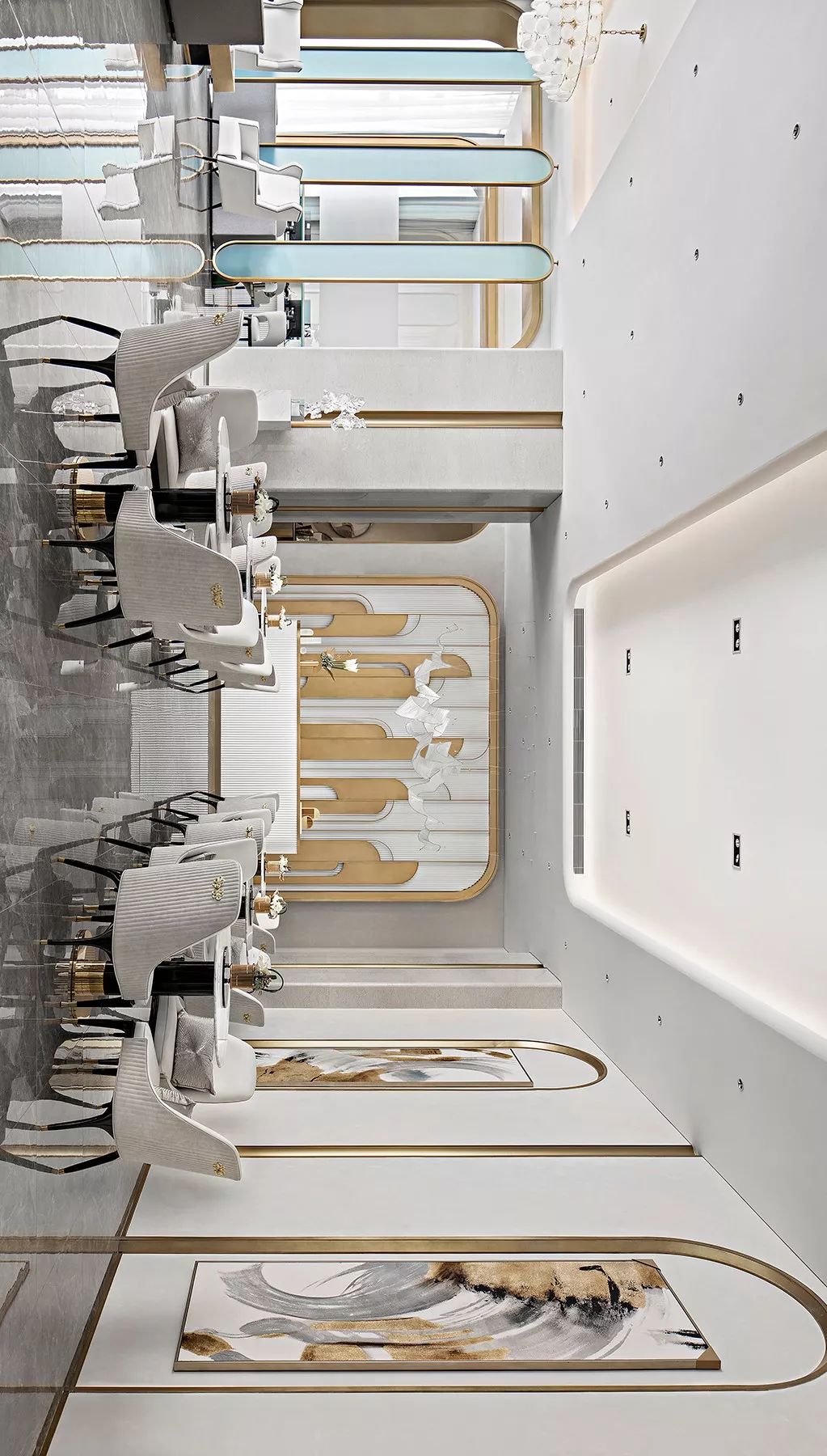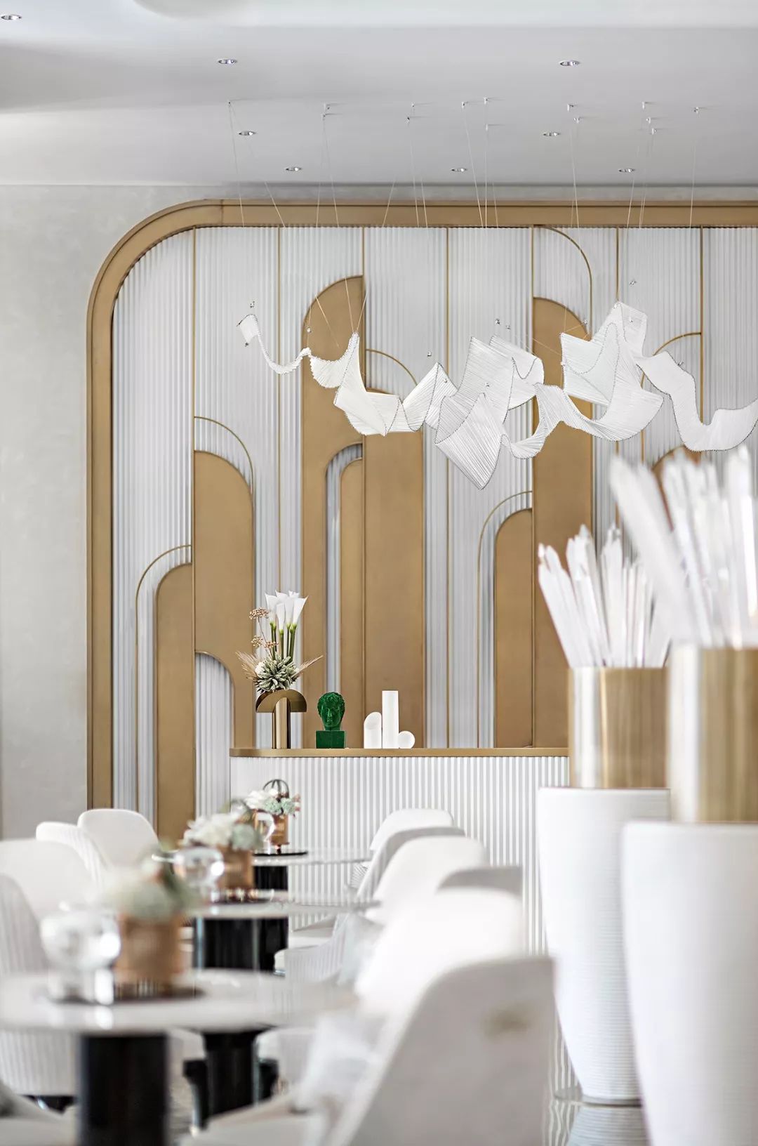 边缘镶嵌香槟色金属条,提升了细节的精致感,轻薄飘逸的“云朵”意形墙面装饰,予人无限的想象,全维度促进成都人对生活的热爱和向往。