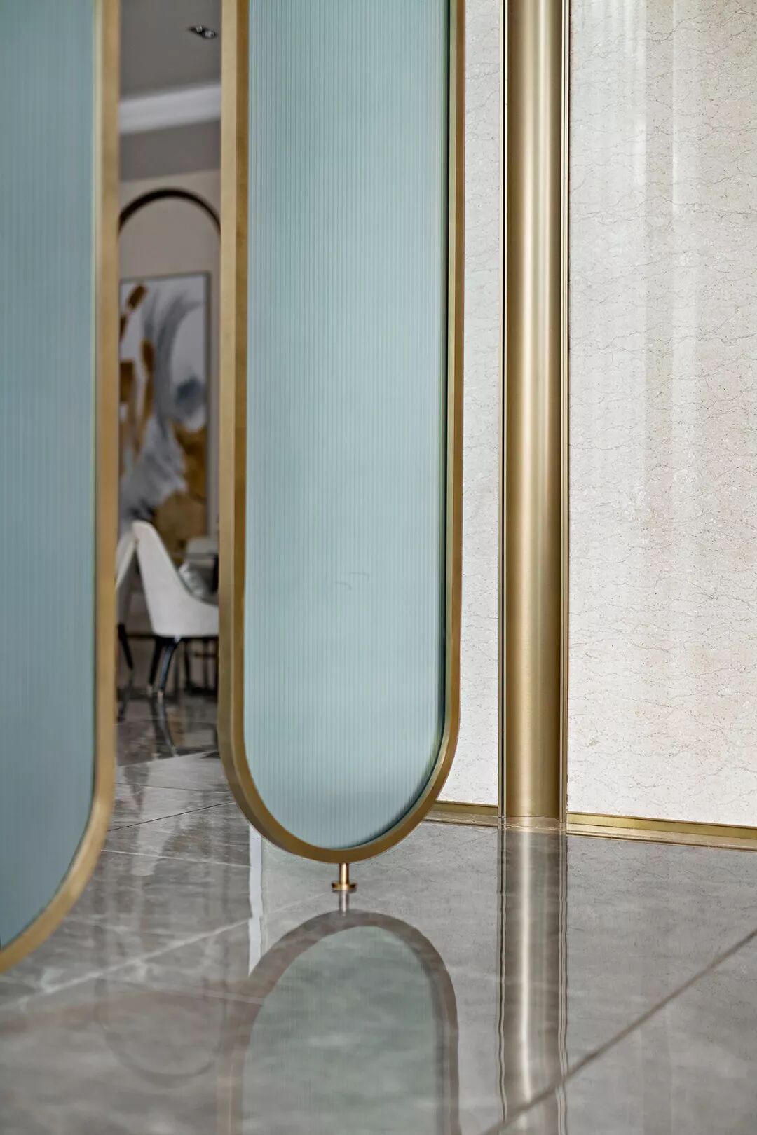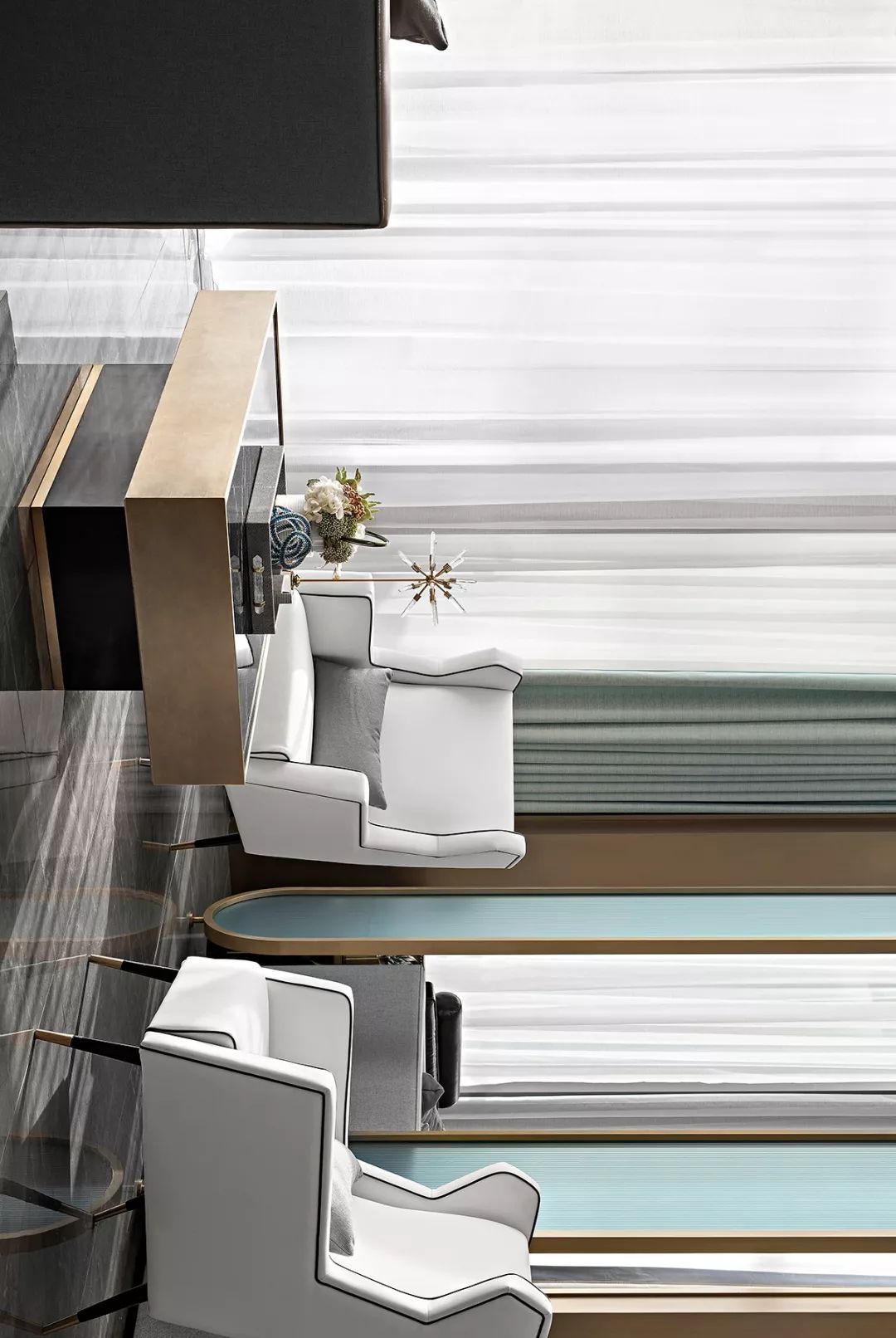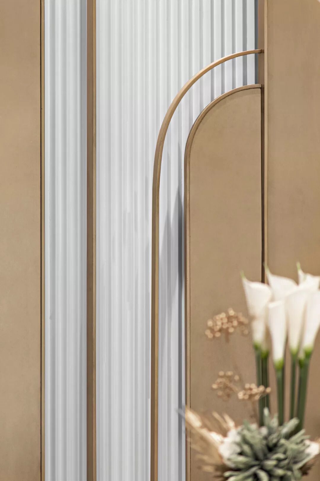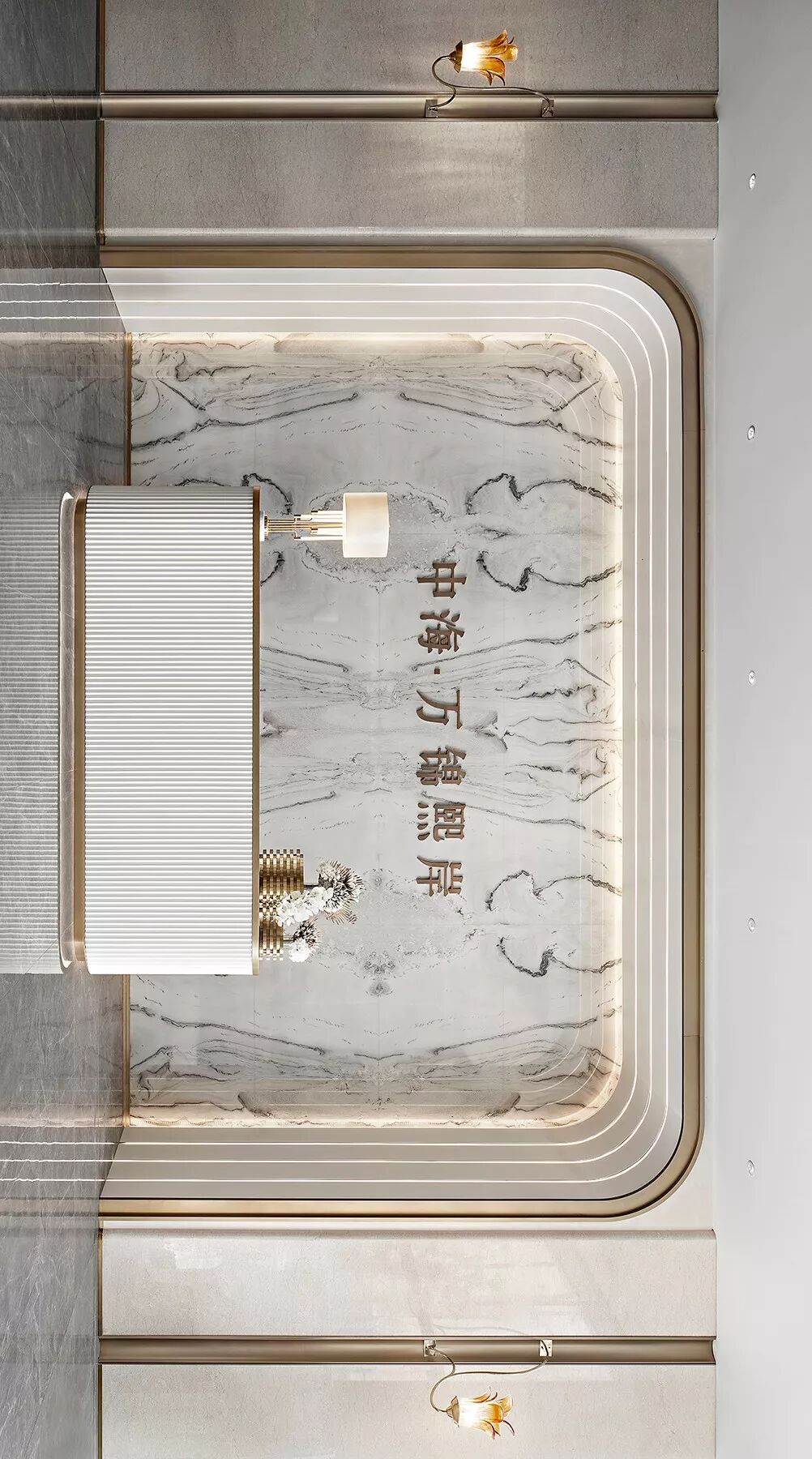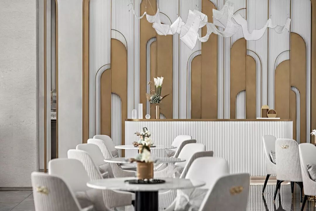 边缘镶嵌香槟色金属条,提升了细节的精致感,轻薄飘逸的“云朵”意形墙面装饰,予人无限的想象,全维度促进成都人对生活的热爱和向往。