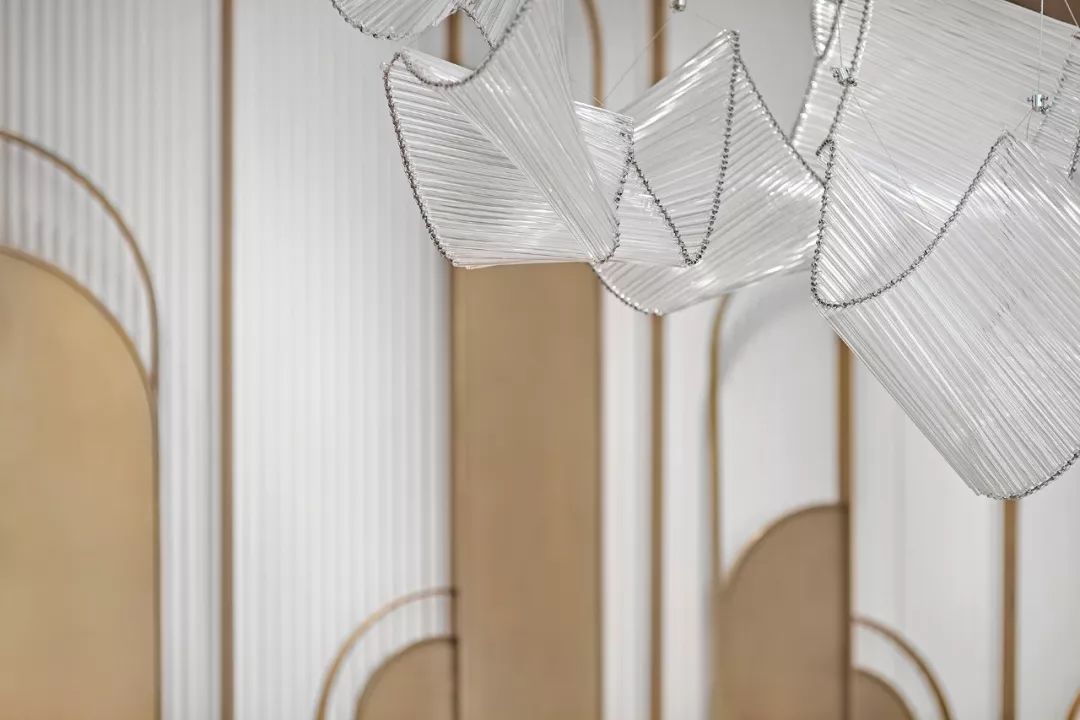 行云流水般的剔透水晶主题吊饰,以“云朵”在天空中的变幻形态为设计概念发想,通过流畅的动感,让视线自由地在空间游走,搭配晶莹的水晶饰物,提升了空间的记忆点与现代感。