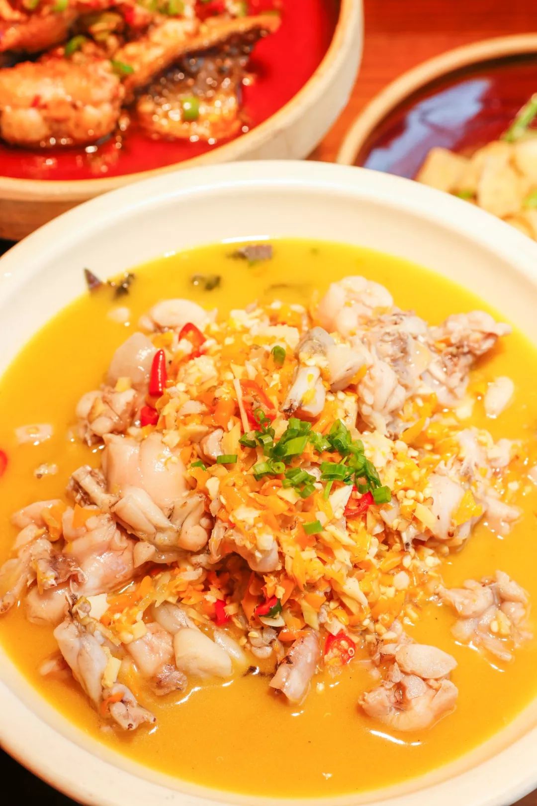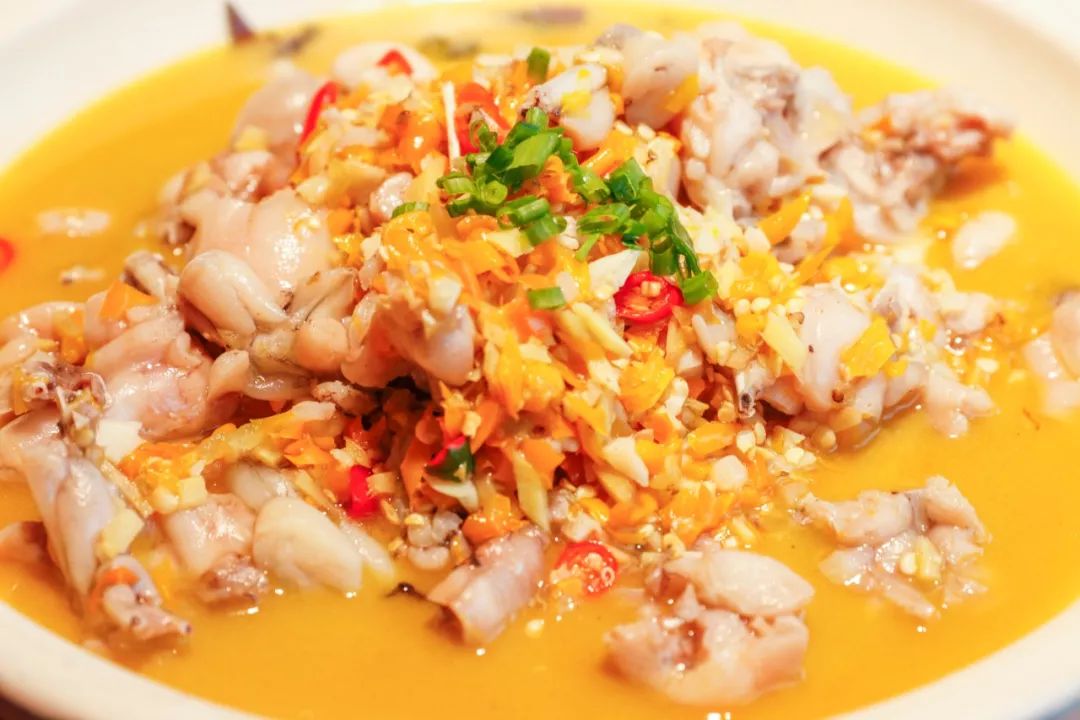 蛙肉嫩白晶莹,躺在碗中,润在汤汁内