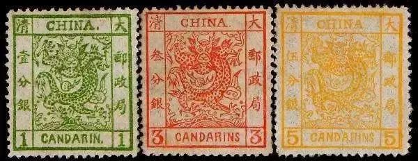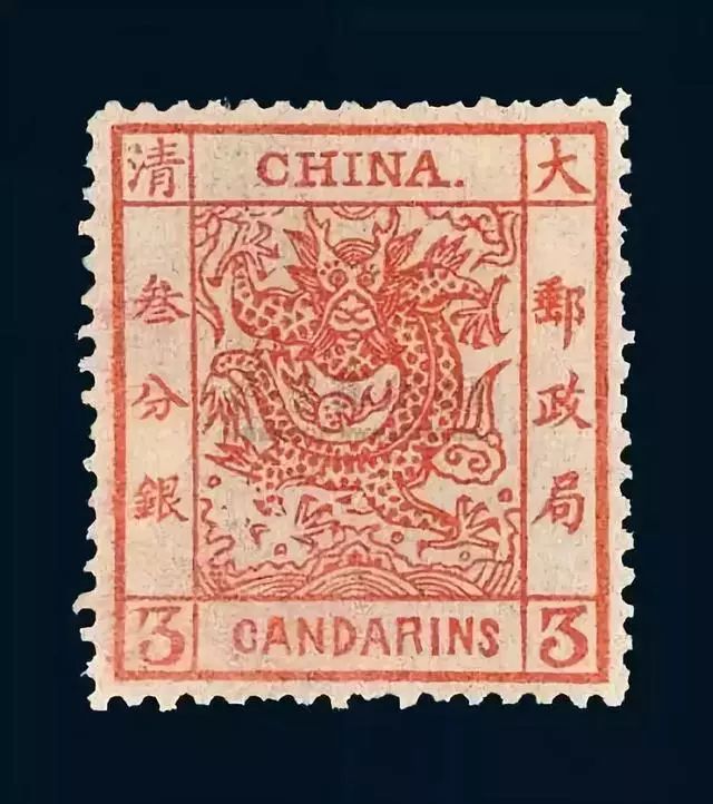 1878年(清光绪四年),清代海关试办邮政,中国开始发行第一套邮票——“大龙邮票”。邮票上“大清邮政局”5个字十分醒目,图案中的“大龙”两目圆睁,腾云驾雾,呼之欲出。上方标有“CHINA(中国)”,下方标有“CANDARINS(海关平银、分银)”字样。