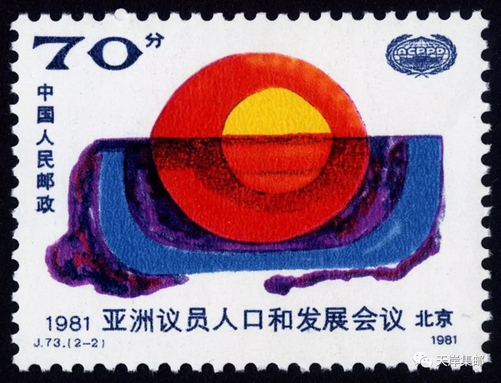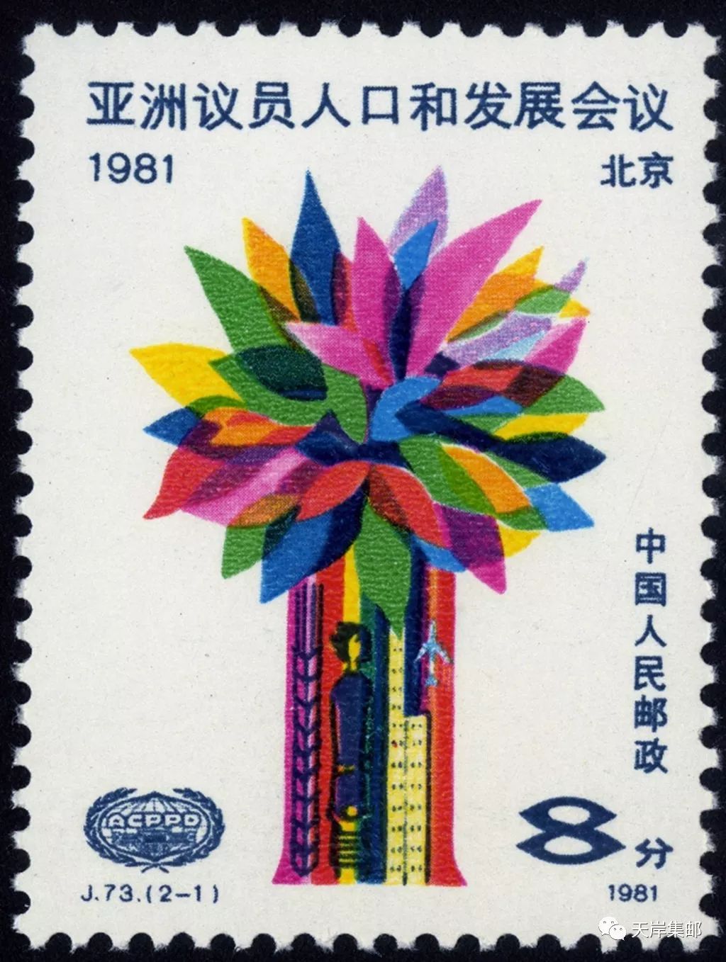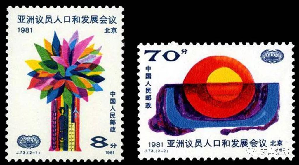这2枚邮票的构思奇特,色彩瑰丽,以抽象的形式从正反两个方面表现了人口和发展必须协调一致的主题。