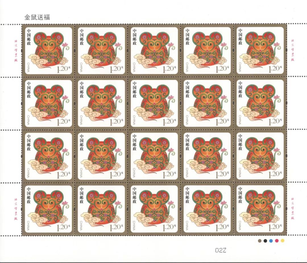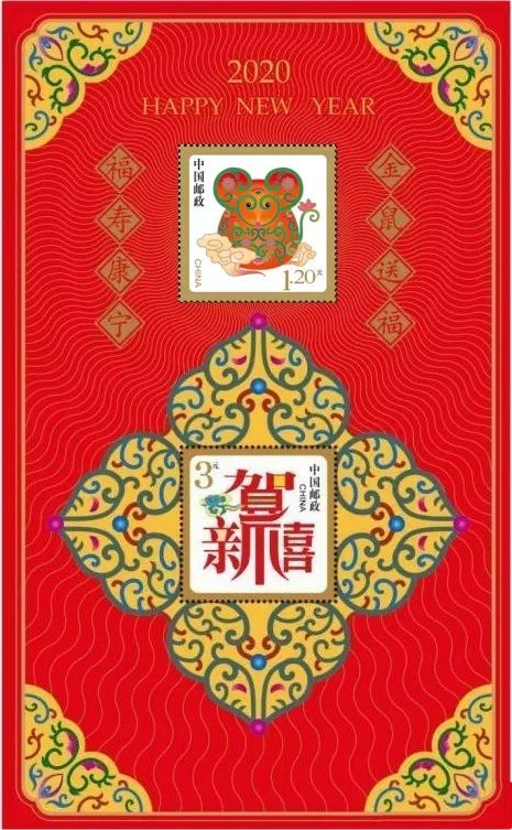 注:采用“金鼠送福”和“贺新禧”邮票印制小全张1枚,规格为115×190毫米,专用于2020年中国邮政贺年有奖产品(祝福卡型15元)。