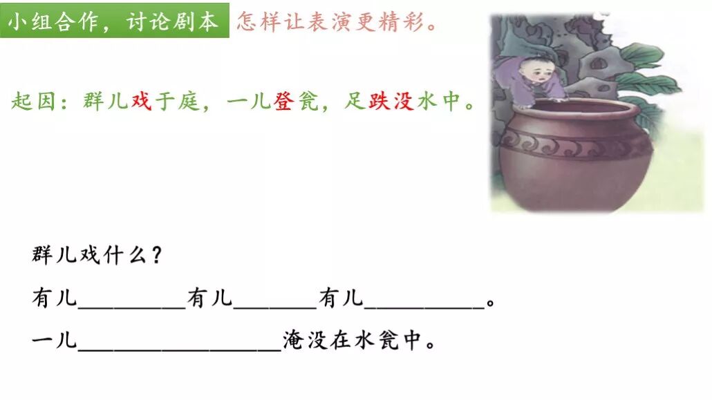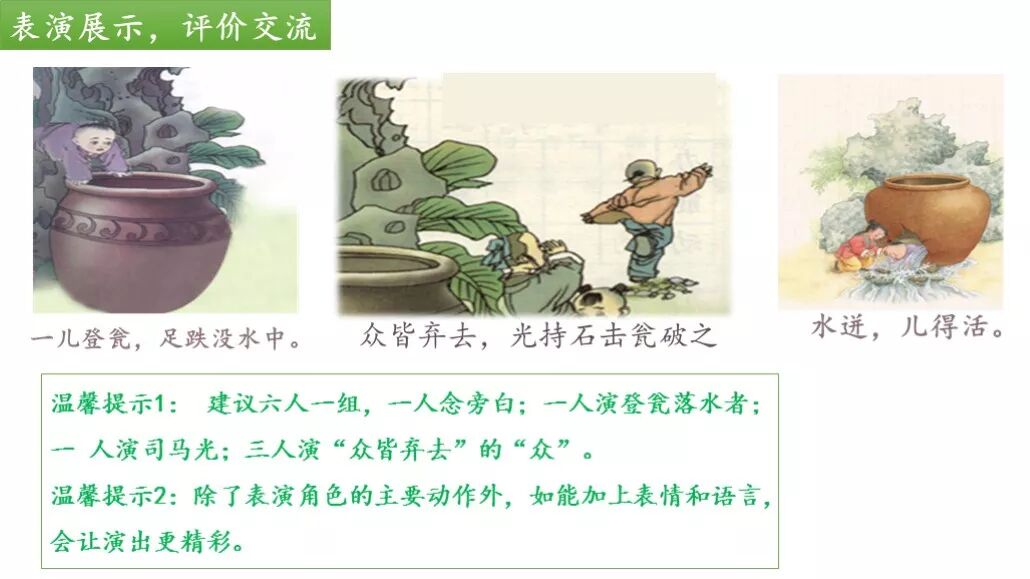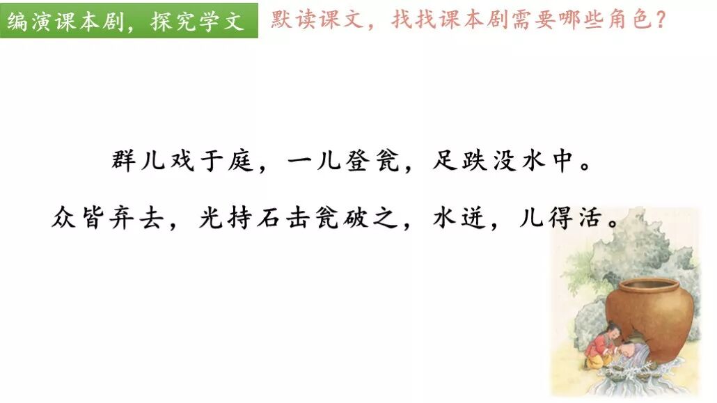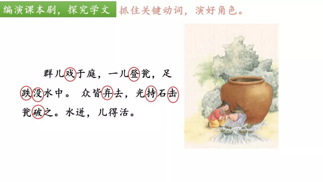 课文内容简短,仅仅30个字。文中用了很多贴切的动词,比如“戏”“登” “跌”“没” “持”“击” “迸”等。课文还配有一幅插图。对应着故事的结局:瓮被砸破,水从瓮中喷涌而出,司马光在一旁扶起得救的小伙伴,插图有助于学生图文结合,理解课文,掌握文中重点词语的意思,感受司马光爱护同伴、机智果敢的美好品质。本节课采用编剧本的形式来学习这篇家喻户晓的文言文,旨在培养学生学习古文的兴趣,在寓教于乐中掌握学习古文的基本方法,为他们进一步了解祖国传统文化做好铺垫。