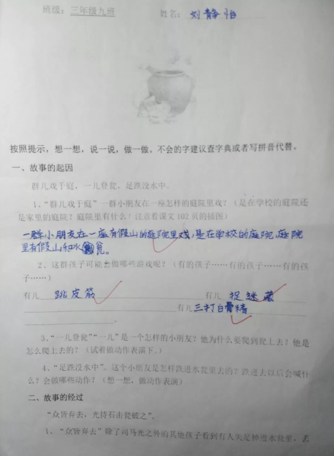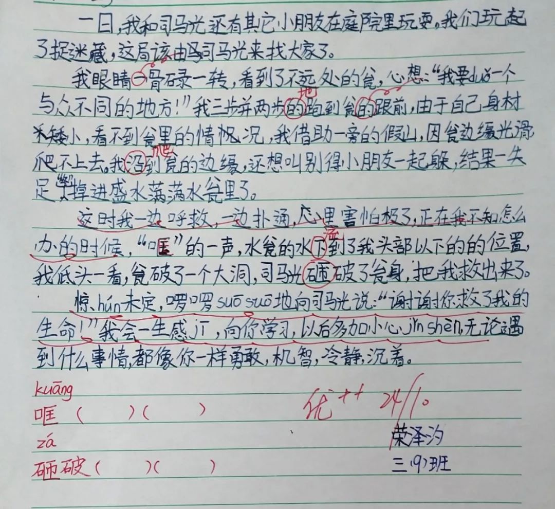瓮里装满了水,掉进去的小朋友在水里不停地扑腾,我一看,不好了,小朋友喝了好多水,再不及时把他救出来,就有生命危险了。其他小伙伴看到这一幕都吓坏了,有的边哭边喊,有的头也不回地跑掉了。看到这样的情景,我脑袋飞速地运转:回去找大人救小朋友,时间肯定来不及;要是自己跳进去救,不但捞不出来小朋友,自己也有可能会被淹死。