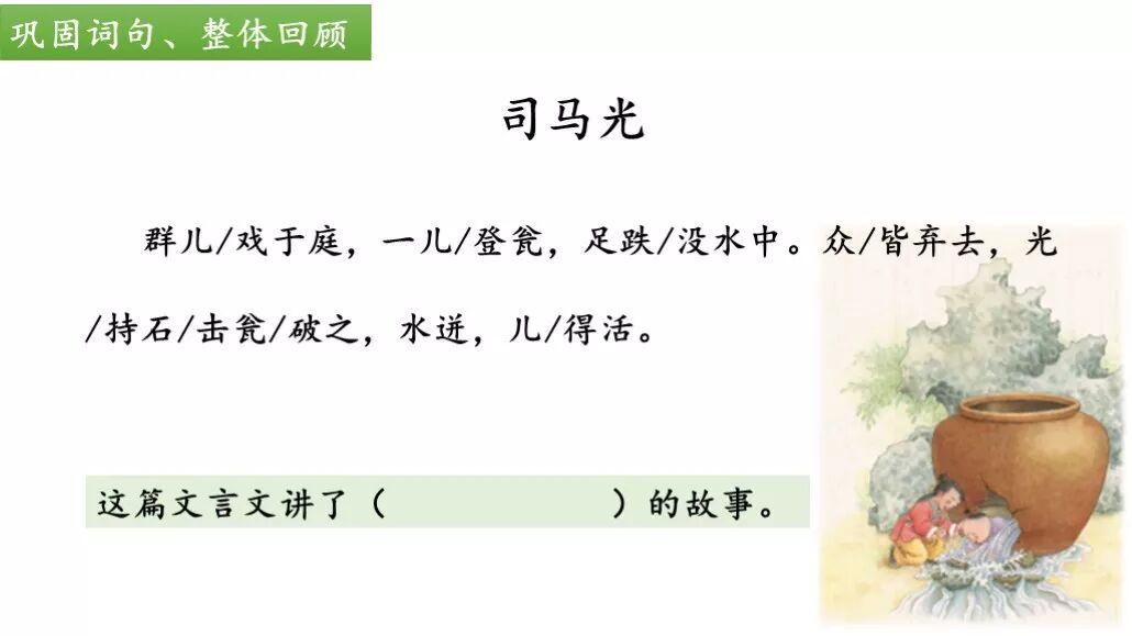 这时候,我挺身而出,从假山上仔细找来一块大石头,用尽全力搬起它,快速地跑到瓮前,把大石头瞄准瓮一扔,瓮被砸破了,落水的小孩逃了出来。