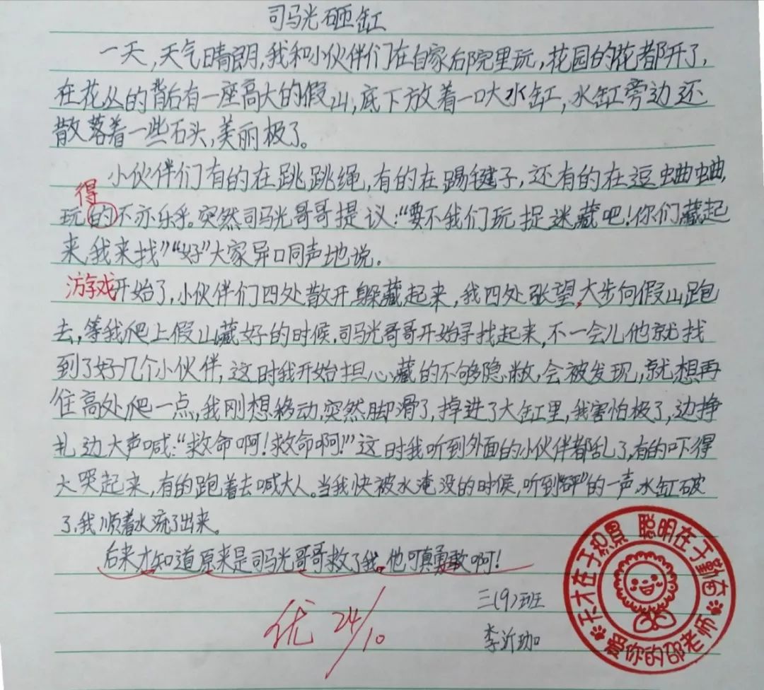 我往周围看了看,发现院子里面有块大石头。顿时,一个好主意涌上心头——可以用石头砸破水瓮,里面的水放出来后,小朋友不就得救了?于是,我搬起大石头,使劲朝着水瓮的肚子狠狠地砸去,只听见“哗啦”一声,水瓮破了个大窟窿,里面的水全部流出来了,落水的小朋友也慢慢地从窟窿里爬出来。他被吓得一直哭,我紧紧地抱住他,安慰道:“没事了,你已经得救了。”不一会儿,小朋友的爸爸妈妈也赶了过来,他们向我道谢后,抱着受到惊吓的小朋友回家去了。