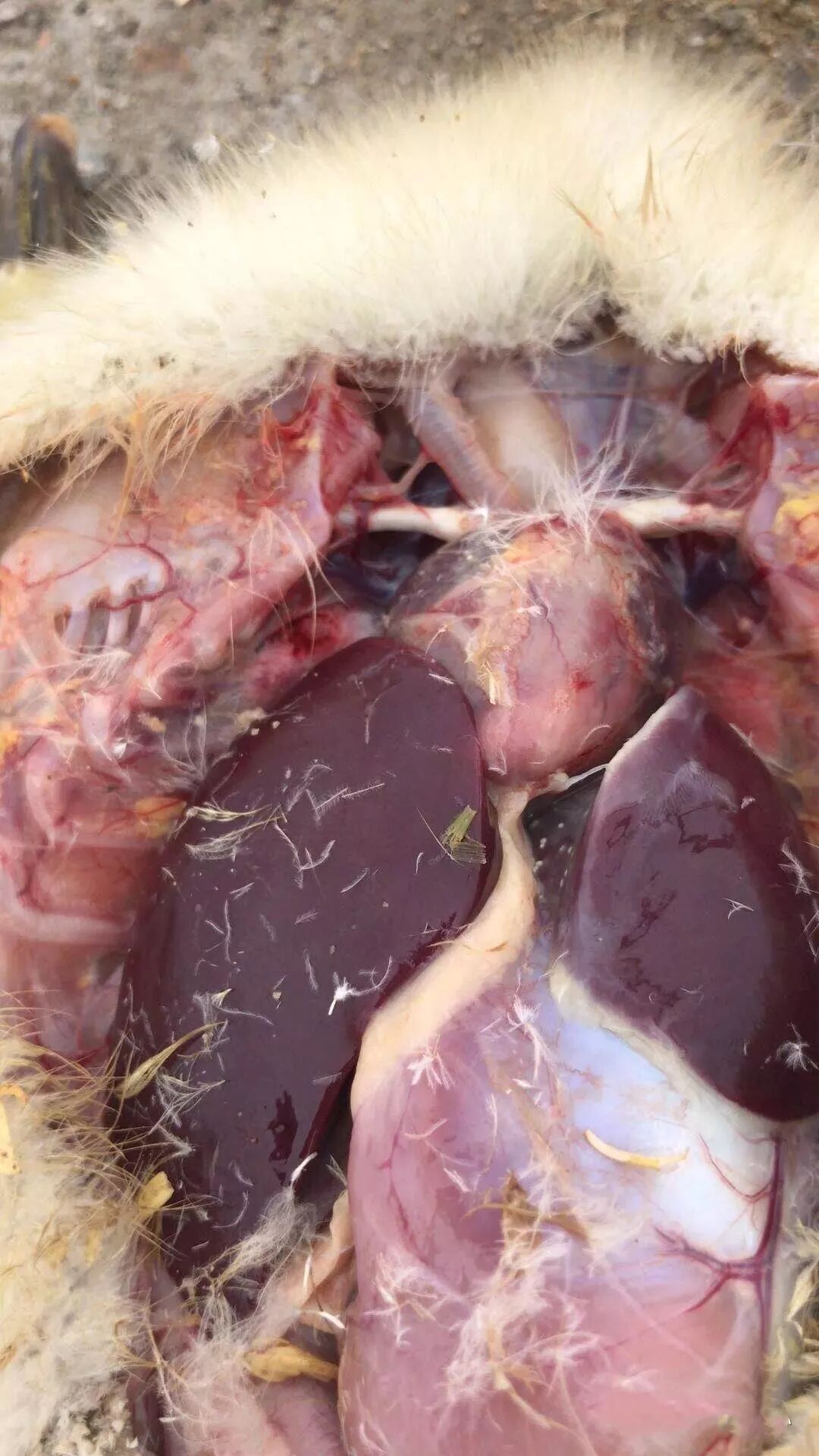 鹅解刨可见全身浆膜有纤维素性渗出,胞膜增厚,胞内有多量乳白色絮状纤维素性渗出物附于心肌壁上。肝肿大,肝包膜增厚呈灰白色,易剥离。胆囊明显增大,内充满胆汁。脾肿大呈红灰色斑马纹状,表面附有纤维素与薄膜,胰腺上有出血点,肾脏出血,十二指肠粘膜出血,内有灰白色或绿色稀粪。充血水肿增厚,上面有有纤维素性渗出物。