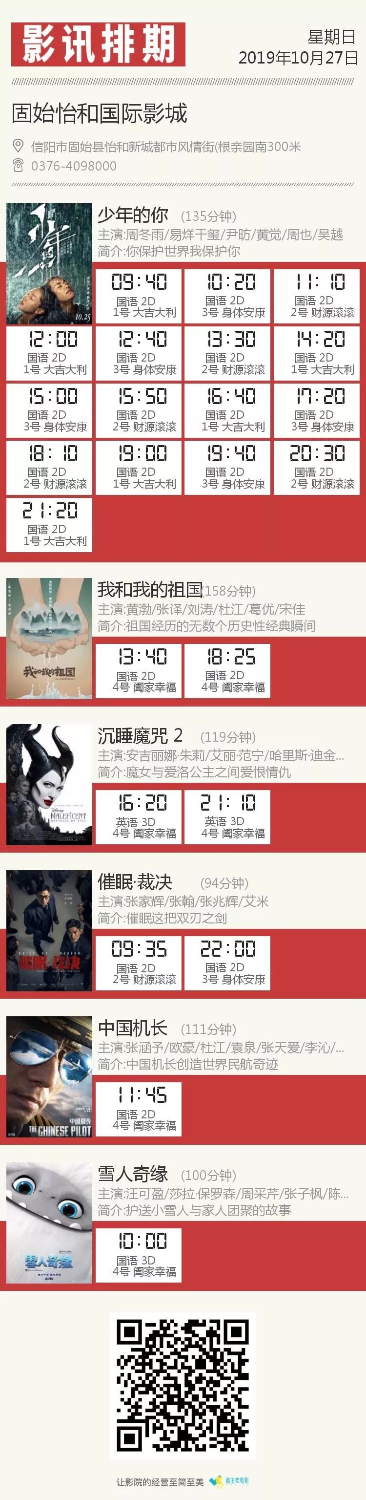 地址:(根亲园南800米)怡和大道与永和大道交叉口东北、怡和首府大厦对面;乘车路线:3路公交、起始点:顺达南站--信和医院途经(怡和国际影城、永和小学——妇幼医院——县政府——秀水公园东门——中原路口——红星医院——国源超市——盐业局———移动公司——信合医院)观影热线:0376-4098000