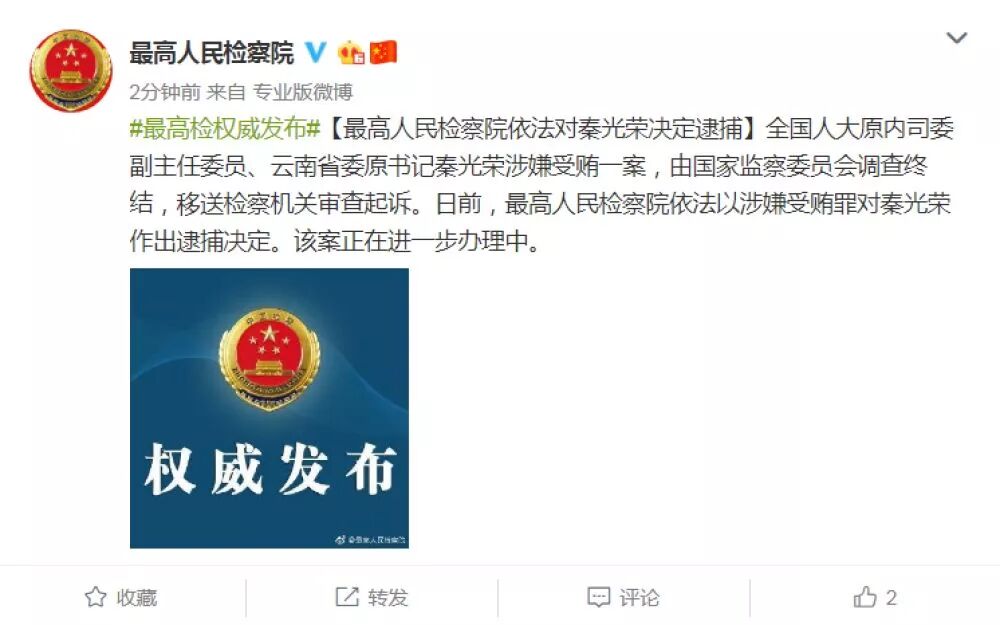 全国人大原内司委副主任委员、云南省委原书记秦光荣涉嫌受贿一案,由国家监察委员会调查终结,移送检察机关审查起诉。日前,最高人民检察院依法以涉嫌受贿罪对秦光荣作出逮捕决定。该案正在进一步办理中。